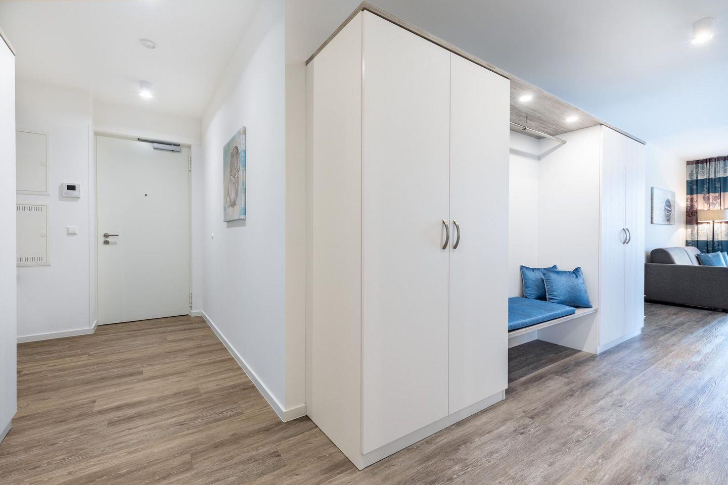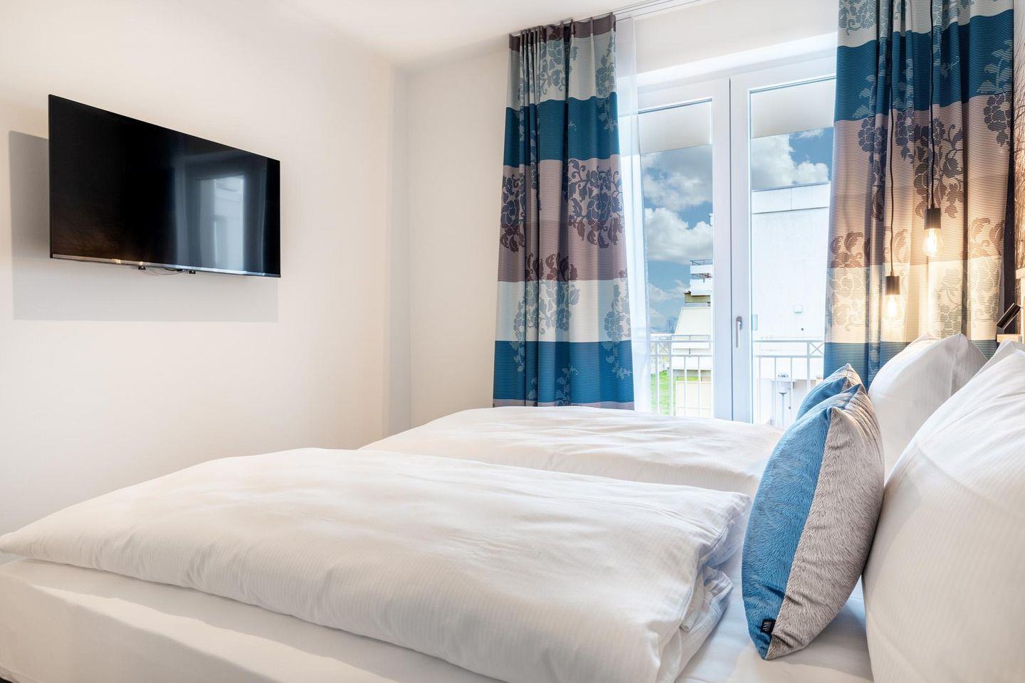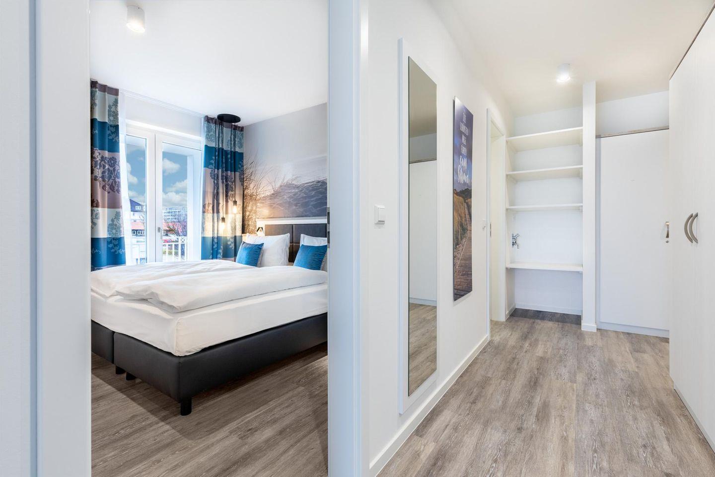 Das 68 m² große 2-Zimmer Apartment ist für bis zu 4 Personen geeignet. Das großzügige Apartment verfügt über gleich zwei sonnige und überdachte Balkone in Süd-Ost- bzw. in Süd-West-Lage; Von hier aus genießt ihr einen einmaligen Blick auf die Ostsee und erlebt das wohltuende Meeresklima.