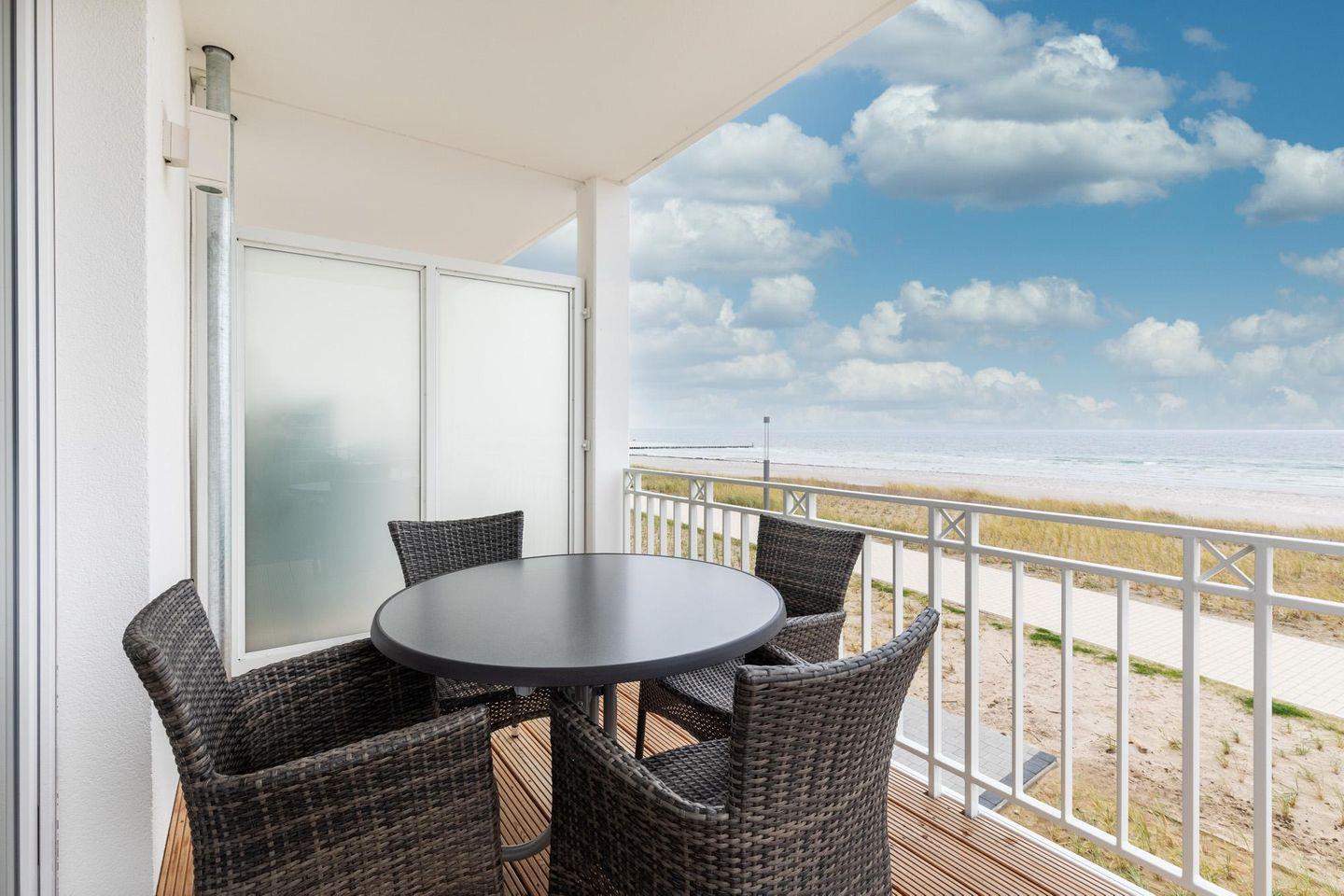 Entspannte und sonnige Stunden mit Panoramablick auf die Ostsee verbringt ihr auf den beiden überdachten und mit Gartenmöbeln ausgestatteten Balkonen in Süd-West- bzw. Süd-Ost-Lage. Der große Balkon mit Strandkorb in südwestlicher Lage mit 12 qm ist sowohl vom Wohnbereich als auch vom Schlafzimmer aus begehbar. Der zweite Balkon in südöstlicher Lage ist 6 qm groß und vom Wohn-Essbereich aus zugänglich. Am Strand steht euch während der Saison ein Strandkorb zur Verfügung.