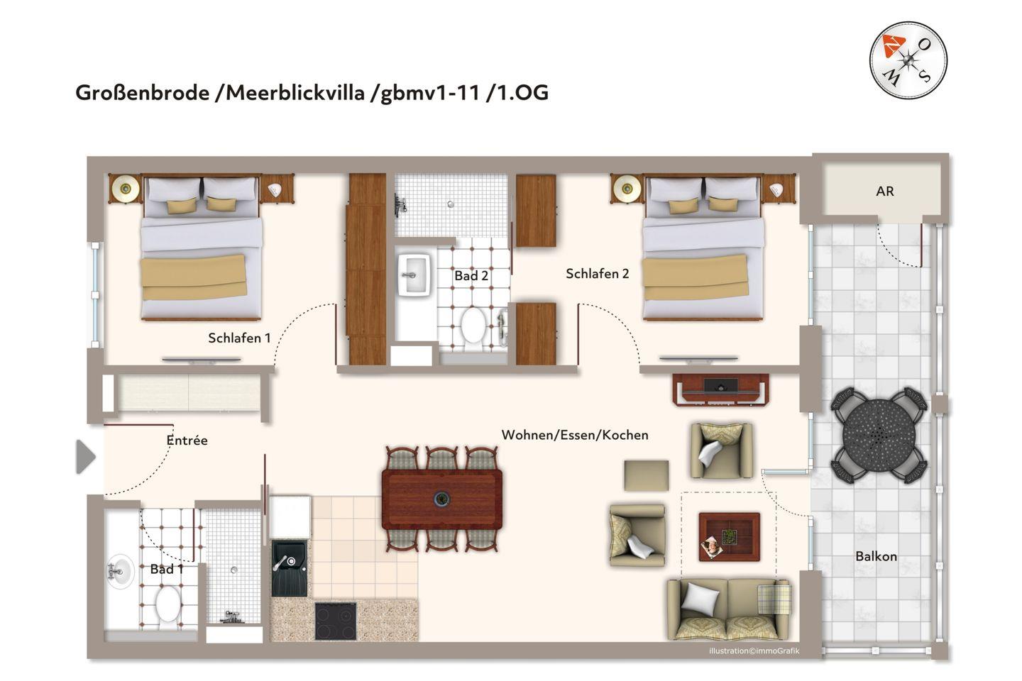 Sonnige Stunden mit Panoramablick auf die See verbringt ihr auf dem großzügigen 10 qm großen Balkon in Süd-Ost-Lage. Der Balkon ist mit Gartenmöbeln ausgestattet und sowohl vom Wohnbereich als auch von einem der Schlafzimmer aus begehbar.