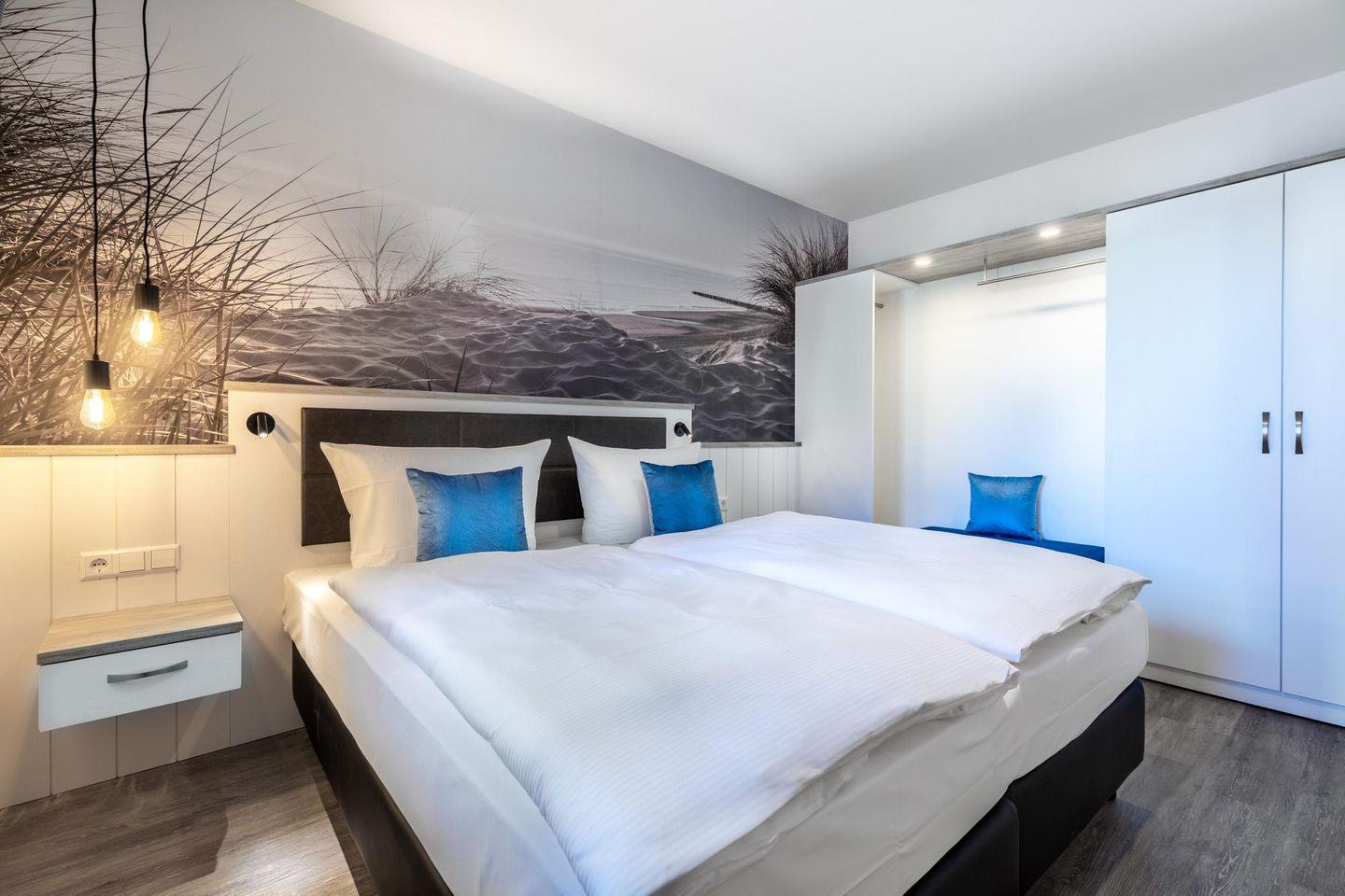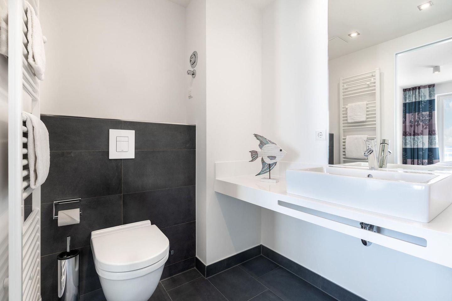 Im modern-behaglichen Wohn-Essbereich befindet sich eine Doppelschlafcouch (1,60 x 1,95 m) und ein großer Flatscreen-TV (43 Zoll). Beide separaten Schlafzimmer bieten hohen Schlafkomfort durch jeweils zwei moderne Boxspringbetten (0,90 x 2,00 m) und sind mit jeweils einem Flatscreen-TV (40 Zoll) und Kleiderschrank ausgestattet. Zwei stilvolle Badezimmer bieten jeweils eine ebenerdige Regendusche, WC, Waschtisch mit Föhn, Handtuchheizkörper und Fußbodenheizung. So beginnt ihr euren Urlaubstag schon morgens ganz entspannt.