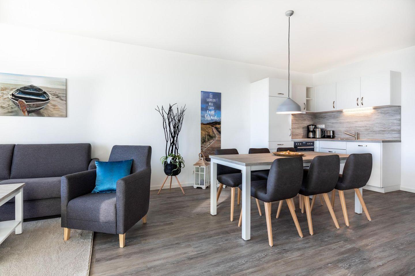 Das lichtdurchflutete und familienfreundliche Nichtraucher-Apartment ist barrierearm und verfügt über Fußbodenheizung, sonnenschutzverglaste und bodentiefe Fensterflächen, kostenfreies WLAN und eine voll ausgestattete offene Küche mit Geschirrspüler, Kühlschrank und Gefrierfach, Kaffeemaschine, Toaster, Wasserkocher, Herd mit Glaskeramikkochfeld und Backofen.
