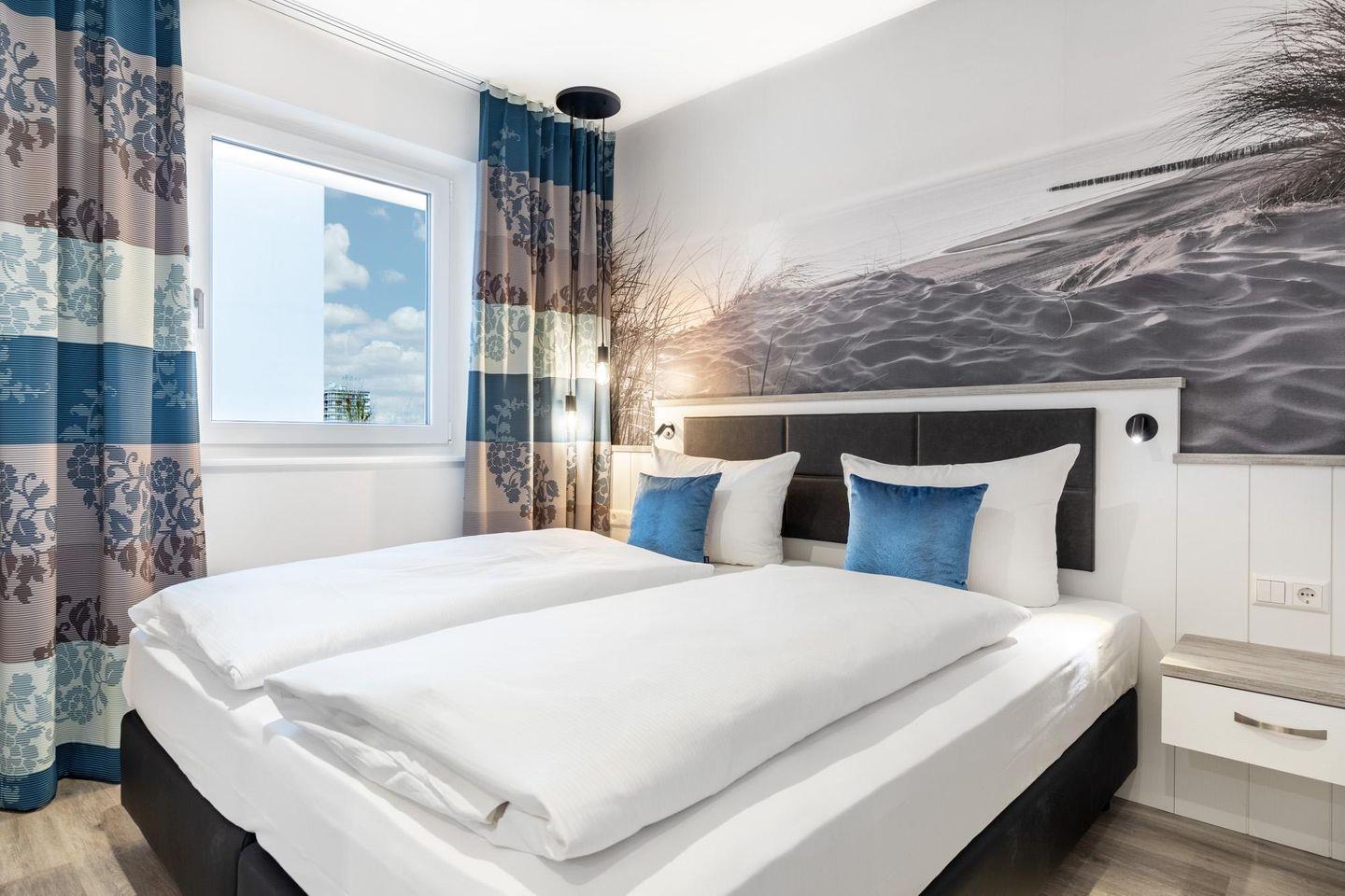 Im modern-behaglichen Wohn-Essbereich befindet sich eine Doppelschlafcouch (1,60 x 1,95 m) und ein großer Flatscreen-TV (43 Zoll). Das separate, nach Nordwesten gelegene Schlafzimmer bietet hohen Schlafkomfort durch zwei moderne Boxspringbetten (0,90 x 2,00 m) und ist mit einem weiteren Flatscreen-TV (40 Zoll) ausgestattet. Im Flur befinden sich Kleiderschrank und Sitz-/Kofferbank. Das stilvolle Badezimmer verfügt über eine ebenerdige Regendusche, WC, Waschtisch mit Föhn, Handtuchheizkörper und Fußbodenheizung.