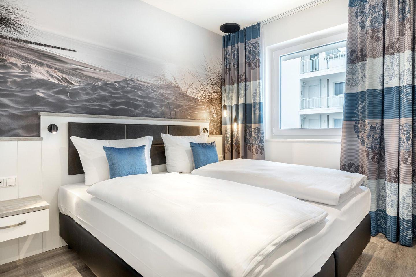 Das 58 m² große 2-Zimmer Apartment ist für bis zu 4 Personen geeignet. Besonders hervorzuheben ist der sonnige und überdachte Balkon in Süd-West-Lage; hier genießt ihr das wohltuende Meeresklima.