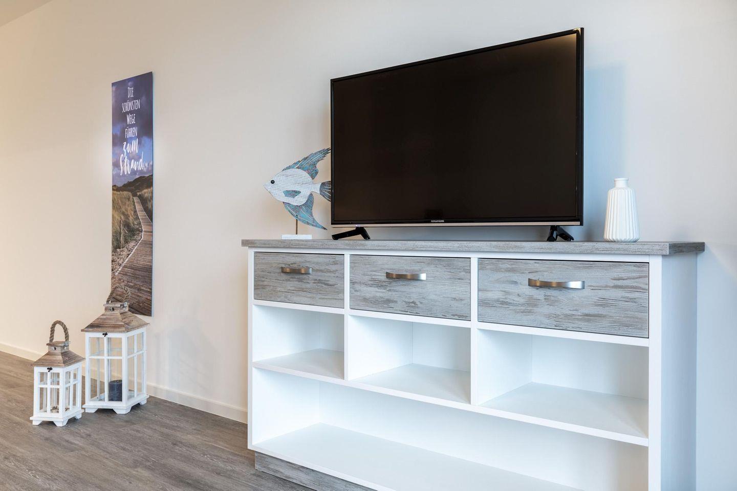 Im modern-behaglichen Wohn-Essbereich befindet sich eine Doppelschlafcouch (1,60 x 1,95 m) und ein großer Flatscreen-TV (43 Zoll). Das separate Schlafzimmer bietet hohen Schlafkomfort durch zwei moderne Boxspringbetten (0,90 x 2,00 m) und ist mit einem weiteren Flatscreen-TV (40 Zoll) ausgestattet. Im Flur befinden sich Kleiderschrank und Sitz-/Kofferbank. Das stilvolle Badezimmer verfügt über eine ebenerdige Regendusche, WC, Waschtisch mit Föhn, Handtuchheizkörper und Fußbodenheizung.