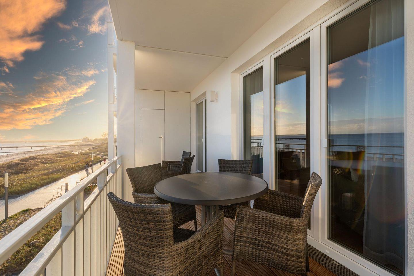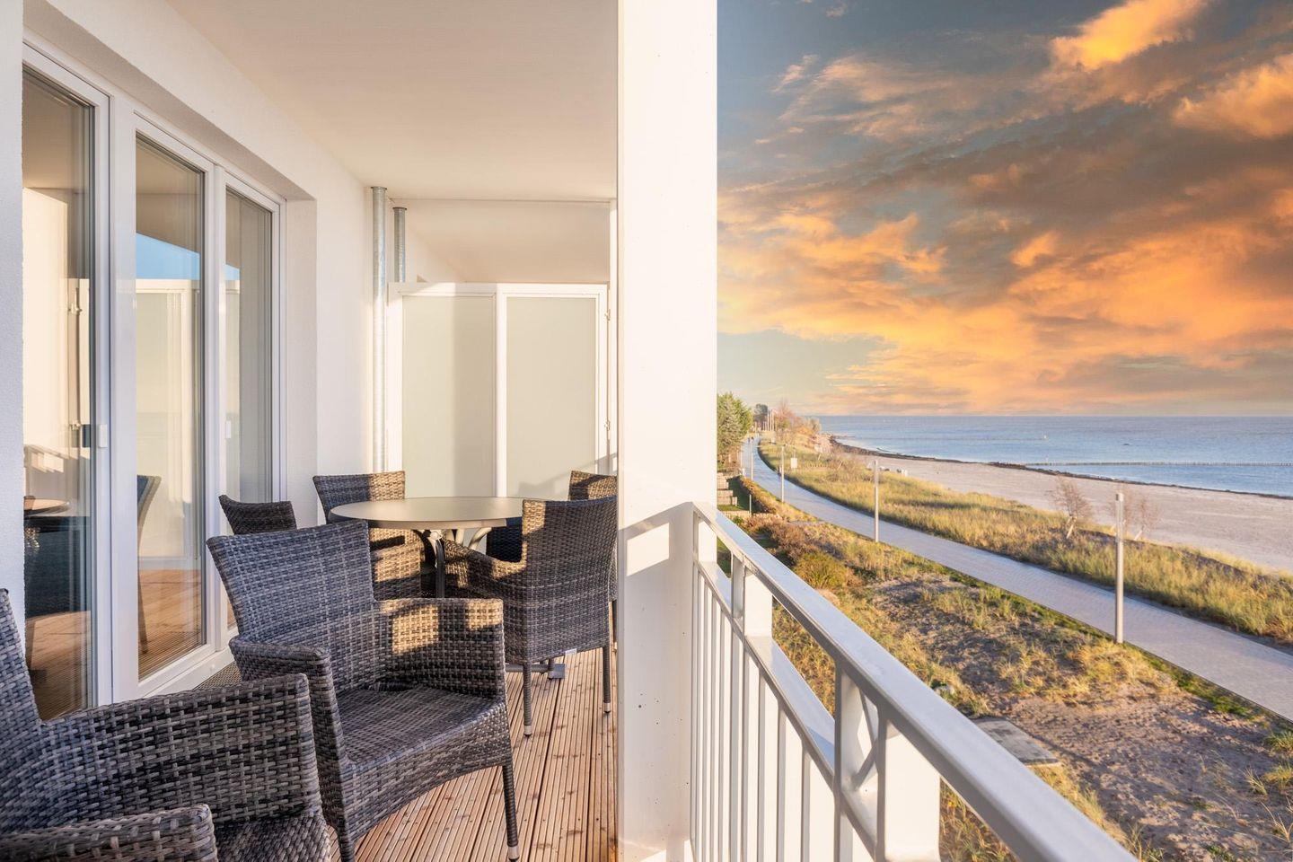Entspannte und sonnige Stunden mit Panoramablick auf die See verbringt ihr auf dem großzügigen 10 qm großen Balkon in Süd-Ost-Lage. Der Balkon ist mit Gartenmöbeln ausgestattet und sowohl vom Wohnbereich als auch von einem der Schlafzimmer aus begehbar.