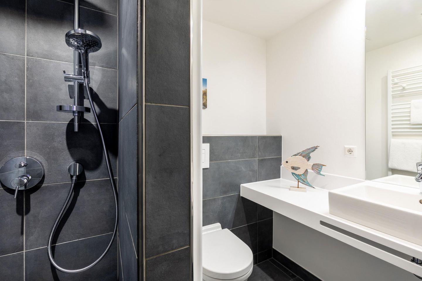 Im modern-behaglichen Wohn-Essbereich befindet sich eine Doppelschlafcouch (1,60 x 1,95 m) und ein großer SMART-TV (65 Zoll). Beide separaten Schlafzimmer bieten hohen Schlafkomfort durch jeweils zwei moderne Boxspringbetten (0,90 x 2,00 m) und sind mit jeweils einem Flatscreen-TV (40 Zoll) und Kleiderschrank ausgestattet. Zwei stilvolle Badezimmer bieten jeweils eine ebenerdige Regendusche, WC, Waschtisch mit Föhn, Handtuchheizkörper und Fußbodenheizung. So beginnt ihr euren Urlaubstag schon morgens ganz entspannt.