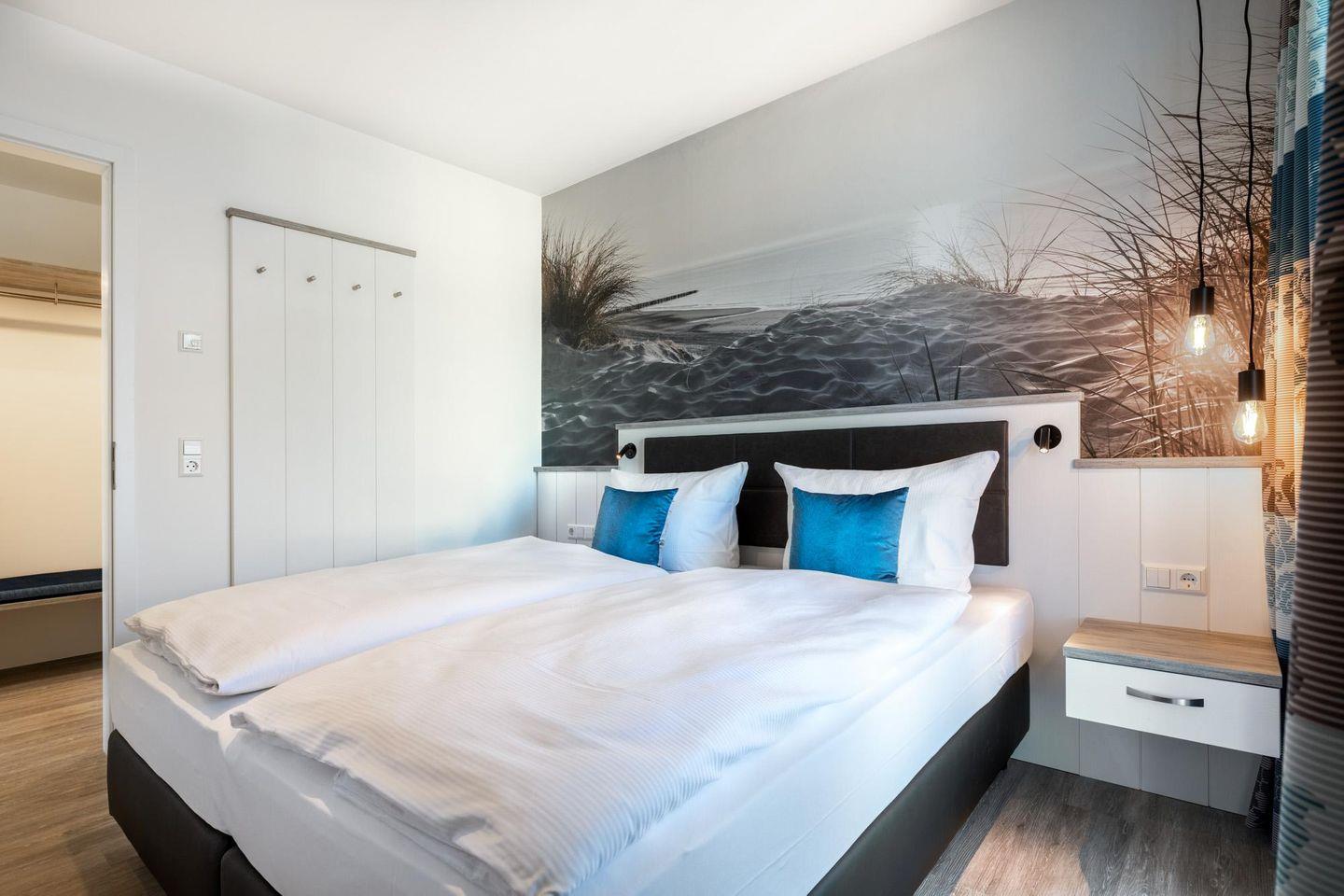Im modern-behaglichen Wohn-Essbereich befindet sich eine Doppelschlafcouch (1,60 x 1,95 m) und ein großer Flatscreen-TV (43 Zoll). Das separate Schlafzimmer bietet hohen Schlafkomfort durch ein modernes Boxspringbett (2 x 0,90 x 2,00 m) und ist mit einem weiteren Flatscreen-TV (40 Zoll) sowie Kleiderschrank und Sitz-/Kofferbank ausgestattet. Das stilvolle Badezimmer verfügt über eine ebenerdige Regendusche, WC, Waschtisch mit Föhn, Handtuchheizkörper und Fußbodenheizung.