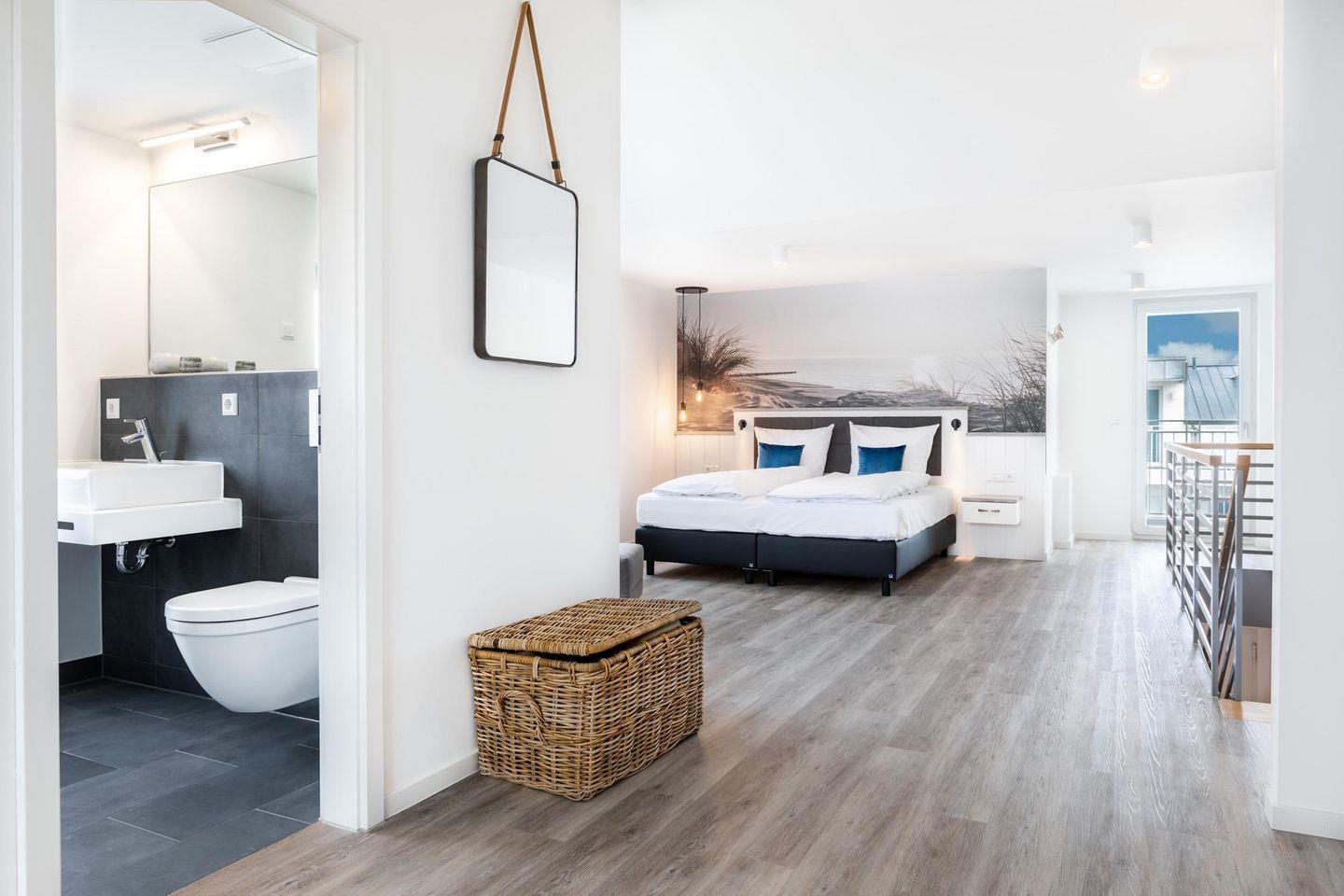 Über die Treppe im Entree gelangt ihr auf die großzügig konzipierte Wohnebene mit Galerie im Dachgeschoss. Hier befindet sich ein zweites Bad mit Badewanne, WC, Waschtisch mit Föhn, Handtuchheizkörper und Fußbodenheizung. Der Schlafbereich auf der Galerie verfügt ebenfalls über zwei modernen Boxspringbetten (0,90 x 2,00 m) und Flatscreen-TV (40 Zoll). Auch auf dieser Ebene befindet sich eine Art französischer Balkon, der fast über die ganze nordwestlich gelegene Seite verläuft. Des Weiteren steht euch in der Saison als Gast dieses Apartments ein Strandkorb am Strand zur Verfügung!