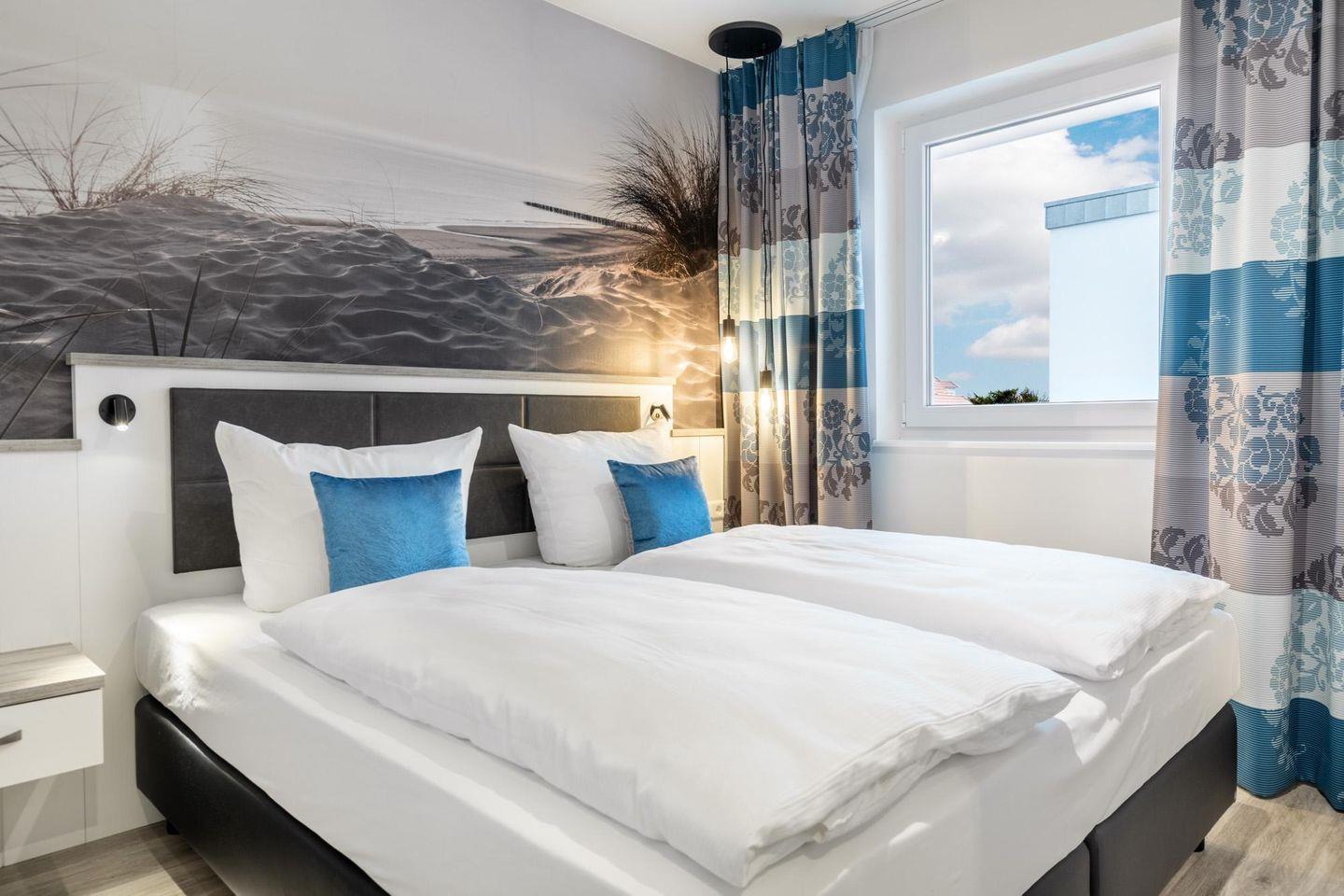 Das moderne und familienfreundliche Nichtraucher-Maisonette-Apartment verfügt über Fußbodenheizung, sonnenschutzverglaste und bodentiefe Fensterflächen und kostenfreies WLAN. Im dritten Obergeschoss befindet sich die voll ausgestattete offene Küche mit Geschirrspüler, Kühlschrank und Gefrierfach, Kaffeemaschine, Toaster, Wasserkocher, Herd mit Glaskeramikkochfeld und Backofen. Auf dieser Ebene befindet sich auch der modern-behagliche Wohn-Essbereich mit Flatscreen-TV (32 Zoll) sowie ein separates, nach Nordosten gelegenes Schlafzimmer mit zwei modernen Boxspringbetten (0,90 x 2,00 m) und einem weiteren Flatscreen-TV (40 Zoll). Das stilvolle Badezimmer auf dieser Wohnebene verfügt über eine ebenerdige Regendusche, WC, Waschtisch mit Föhn, Handtuchheizkörper und Fußbodenheizung.