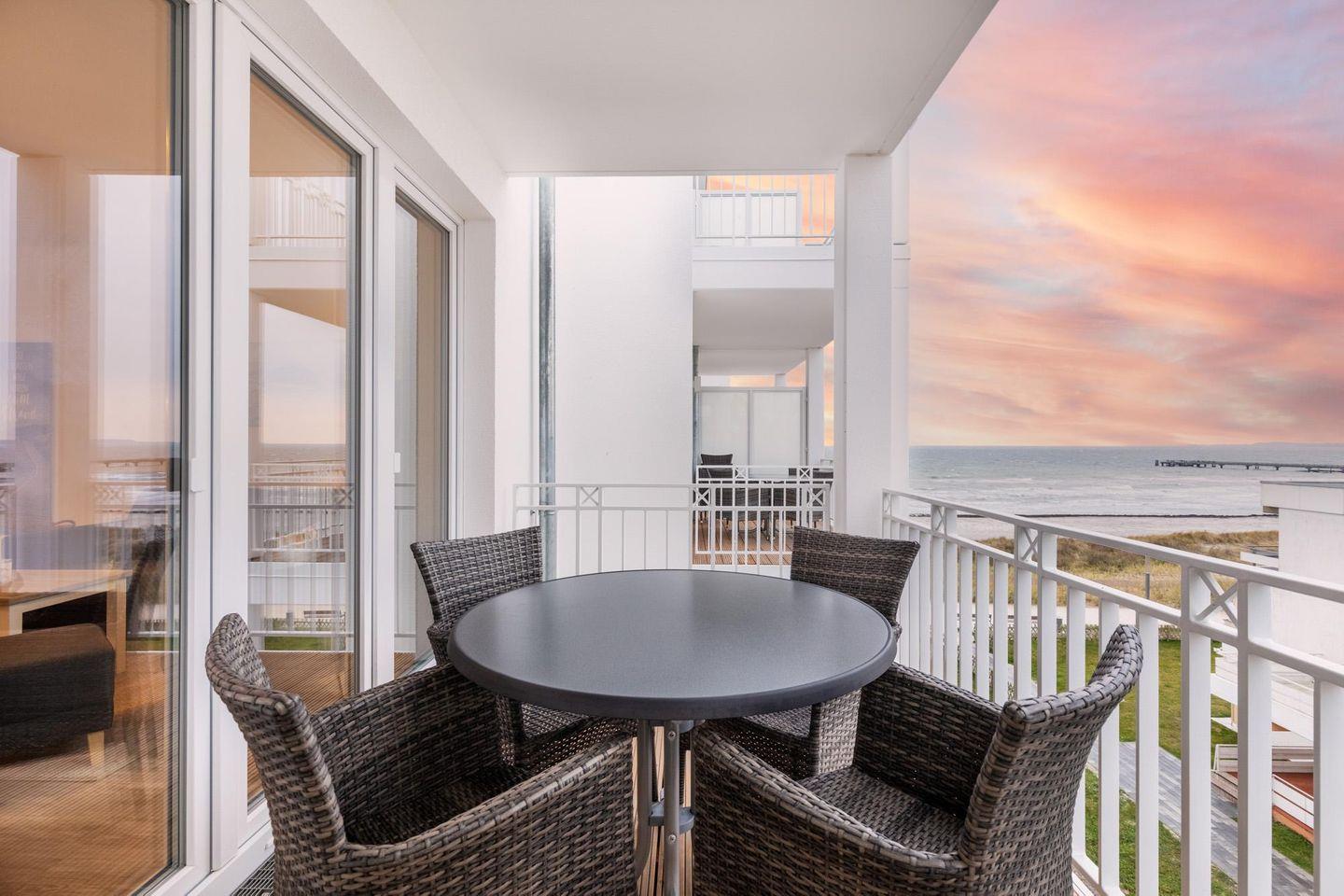 Entspannte und sonnige Stunden mit seitlichem Meerblick auf die Ostsee verbringt ihr auf dem überdachten und mit Gartenmöbeln ausgestatteten Balkon in Süd-West-Lage. Der Balkon ist vom Wohnbereich aus zugänglich.