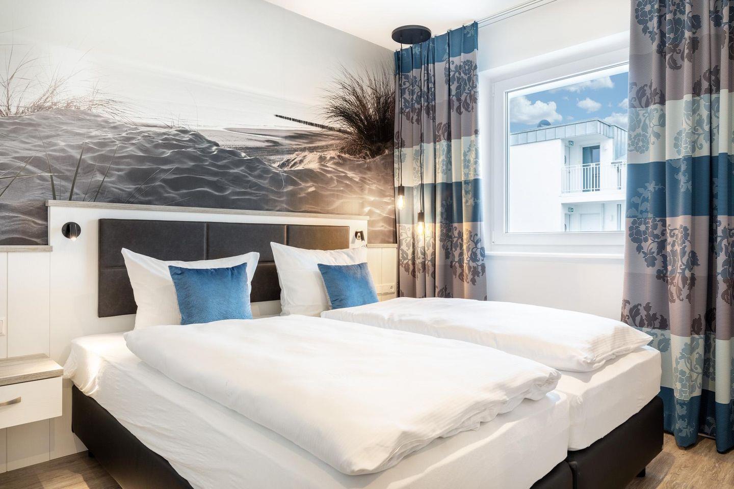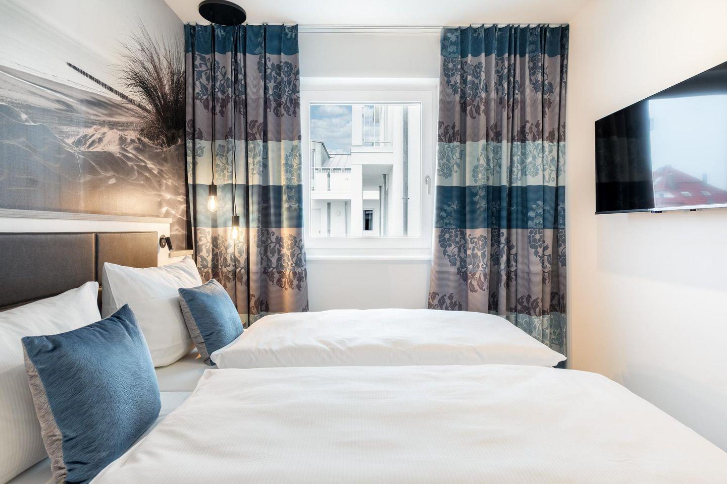 Das moderne und familienfreundliche Nichtraucher-Penthaus verfügt über Fußbodenheizung, sonnenschutzverglaste und bodentiefe Fensterflächen und kostenfreies WLAN. Im dritten Obergeschoss befindet sich die voll ausgestattete offene Küche mit Geschirrspüler, Kühlschrank und Gefrierfach, Kaffeemaschine, Toaster, Wasserkocher, Herd mit Glaskeramikkochfeld und Backofen. Auf dieser Ebene befindet sich auch der modern-behagliche Wohn-Essbereich mit Doppelschlafcouch (1,60 x 1,95 m) und großem Flatscreen-TV (55 Zoll), ein Internet-Stereo-Radio inkl. DAB plus Bluetooth sowie ein separates, nach Nordosten gelegenes Schlafzimmer mit zwei modernen Boxspringbetten (0,90 x 2,00 m) und einem weiteren Flatscreen-TV (40 Zoll). Brettspiele und Kinderspielzeuge sind ebenfalls vorhanden.