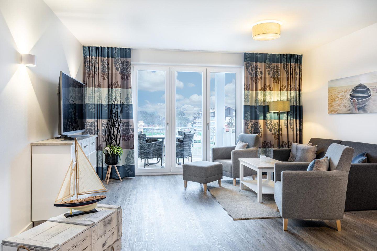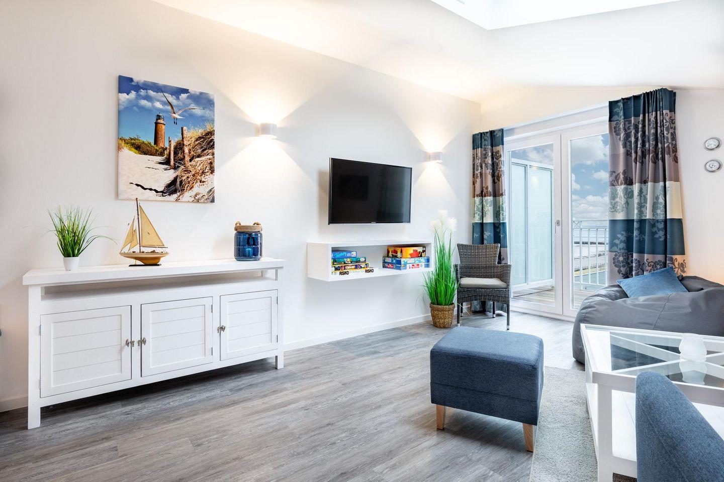 Die 107 m² große und luxuriöse 3-Zimmer Penthaus-Maisonette ist für bis zu 6 Personen geeignet. Das großzügige Apartment verfügt über zwei Wohnebenen und jeweils einen sonnigen Balkon in Süd-West-Lage mit eigenem Strandkorb; in diesem Apartment sitzt ihr in der ersten Reihe und habt einen Blick bis zur Ostsee- Meeresrauschen inklusive!