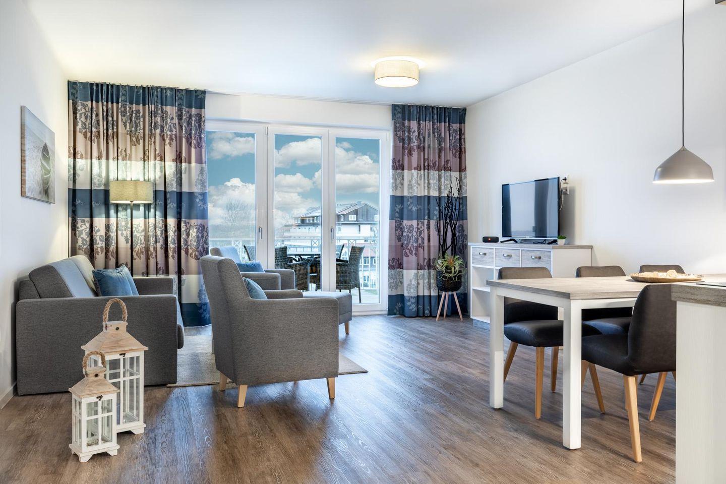 Die 107 m² große und luxuriöse 3-Zimmer Penthaus-Maisonette ist für bis zu 6 Personen geeignet. Das großzügige Apartment verfügt über zwei Wohnebenen mit Galerie und zwei sonnigen Balkonen in Süd-West-Lage; einer davon mit eigenem Strandkorb. Genießet den Ausblick bis zur Ostsee - Meeresrauschen inklusive!