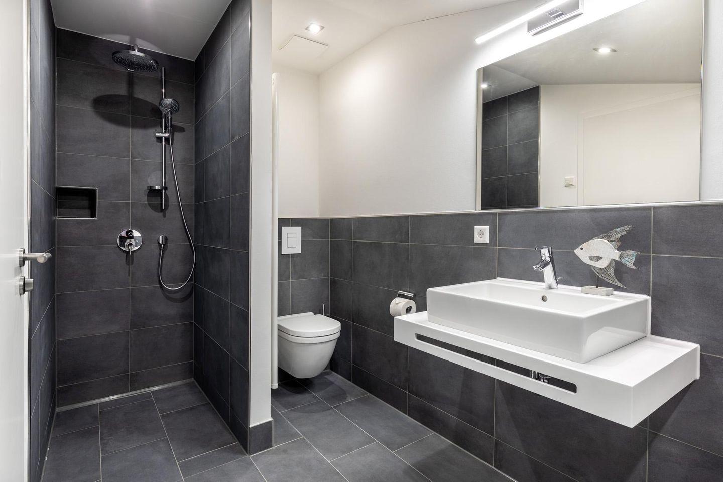 Das stilvolle Badezimmer auf dieser Wohnebene verfügt über eine ebenerdige Regendusche, WC, Waschtisch mit Föhn, Handtuchheizkörper und Fußbodenheizung. Entspannte und sonnige Stunden mit Blick bis zur Ostsee verbringt ihr auf dem überdachten und mit Gartenmöbeln ausgestatteten Balkon in Süd-West-Lage. Der Balkon ist vom Wohnbereich aus zugänglich.