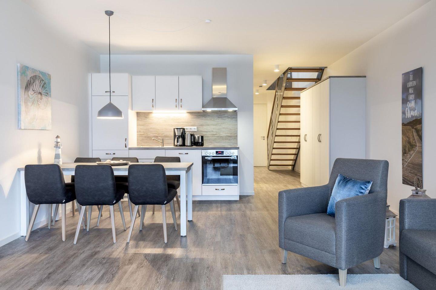 Das moderne und familienfreundliche Nichtraucher-Penthaus verfügt über Fußbodenheizung, sonnenschutzverglaste und bodentiefe Fensterflächen und kostenfreies WLAN. Im dritten Obergeschoss befindet sich die voll ausgestattete offene Küche mit Geschirrspüler, Kühlschrank und Gefrierfach, Kaffeefilter- und Kaffeekapselmaschine (Nespresso), Toaster, Wasserkocher, Herd mit Glaskeramikkochfeld und Backofen. Auf dieser Ebene befindet sich auch der modern-behagliche Wohn-Essbereich mit Couch und großem Flatscreen-TV (43 Zoll) sowie ein separates, nach Nordosten gelegenes Schlafzimmer mit zwei modernen Boxspringbetten (0,90 x 2,00 m) und einem weiteren Flatscreen-TV (40 Zoll).