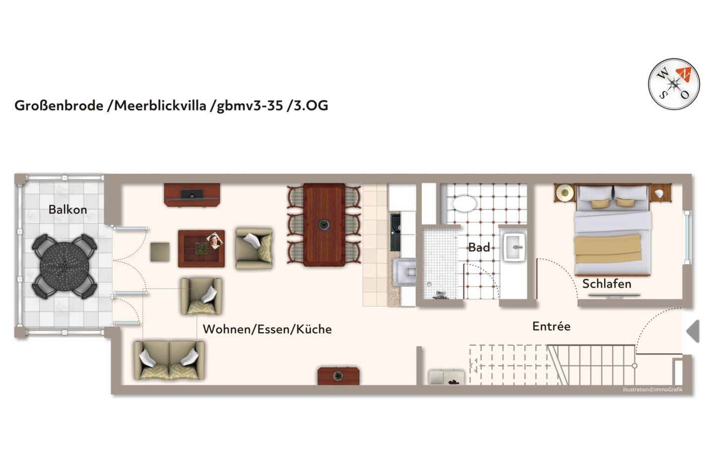 Das exklusive Penthaus befindet sich in südwestlicher Lage und verläuft über das dritte Obergeschoss und über das Dachgeschoss der Apartmentanlage Meerblickvilla. Die Ostsee liegt direkt vor eurer Haustür - in nur 25 Metern befindet sich der feinsandige, wunderschöne Südstrand mit seiner Strandpromenade, der Seemole und der 230 Meter langen Seebrücke. Genießt einen traumhaften Blick auf die Ostsee und das bunte Strandleben.