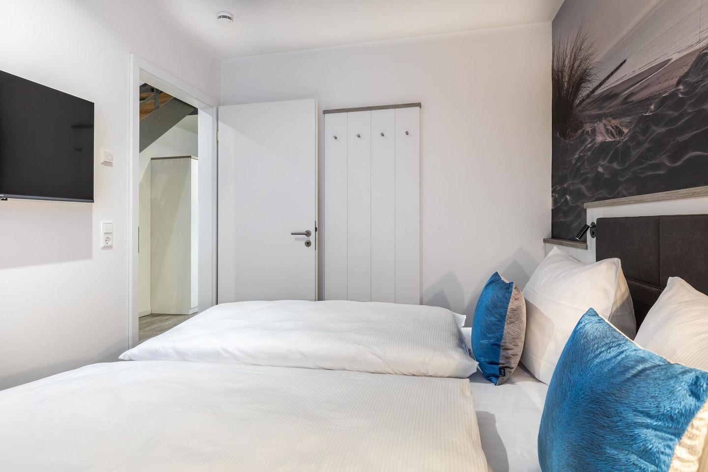 Über die Treppe im Entree gelangt ihr auf die großzügig konzipierte Wohnebene mit Galerie im Dachgeschoss. Hier befindet sich ein zweites Bad mit Badewanne, ebenerdiger Regendusche, WC, Waschtisch mit Föhn, Handtuchheizkörper und Fußbodenheizung. Der Schlafbereich auf der Galerie verfügt ebenfalls über zwei moderne Boxspringbetten (0,90 x 2,00 m), Flatscreen-TV (40 Zoll), Kleiderschrank und Sitz-/Kofferbank sowie über eine Doppelschlafcouch (1,60 x 1,95 m). Auch diese Ebene besitzt einen Balkon in sonniger Süd-West-Lage; hier sogar mit eigenem Strandkorb. Der seitliche Blick auf das Meer und den vorgelagerten Strand ist einfach einmalig schön.