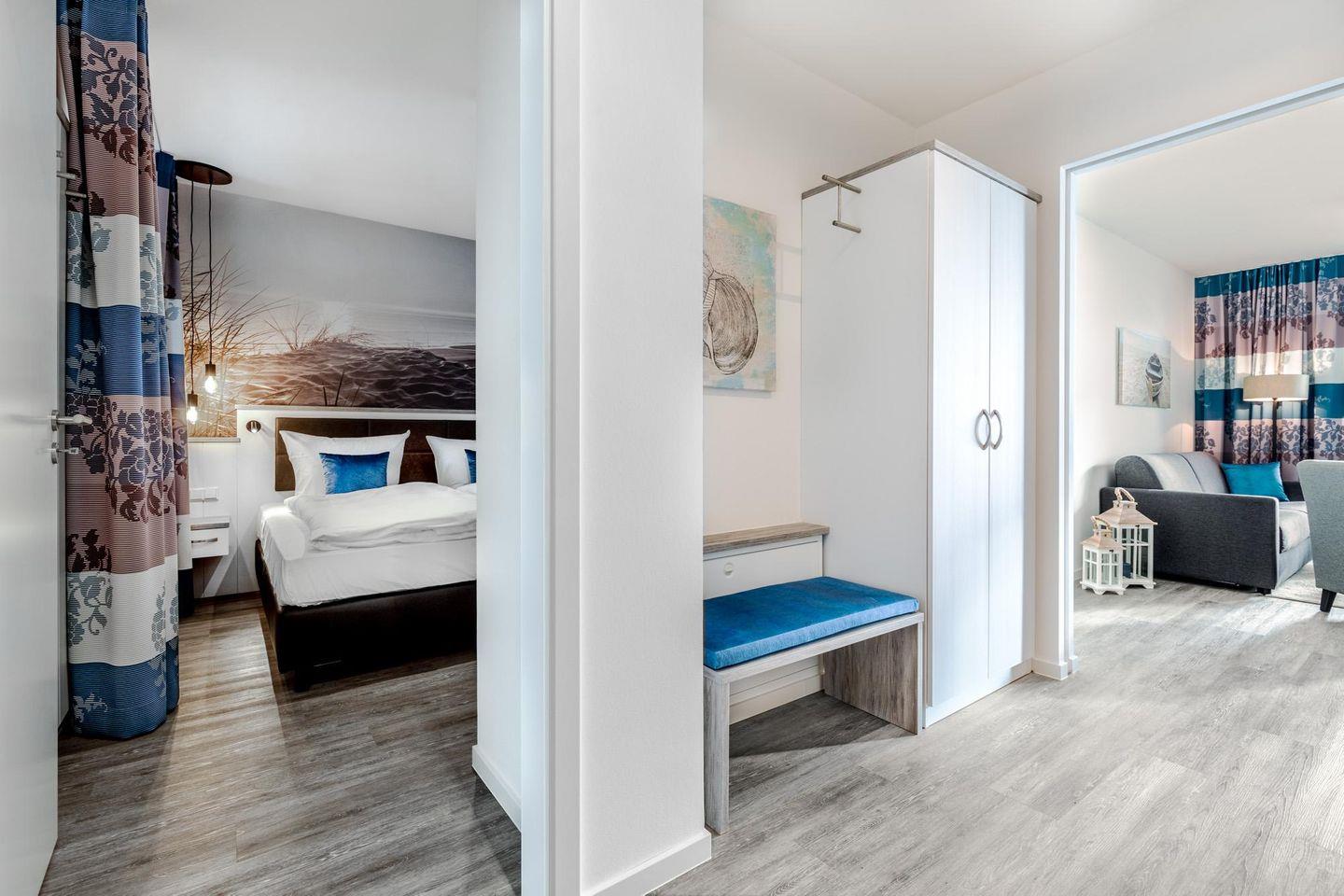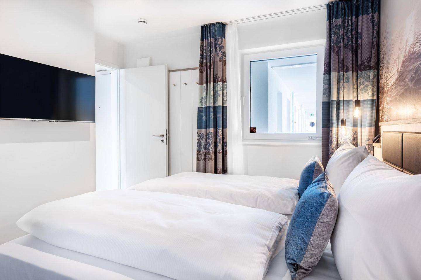 Im modern-behaglichen Wohn-Essbereich befindet sich eine Doppelschlafcouch (1,60 x 1,95 m) und ein großer Flatscreen-TV (43 Zoll). Zwei separate Schlafzimmer bieten hohen Schlafkomfort durch moderne Boxspringbetten mit einem Doppelbett (1,80 x 2,00 m) und sind mit jeweils einem Flatscreen-TV (40 Zoll) und Kleiderschrank ausgestattet. Eines der Schlafzimmer verfügt über einen eigenen, kleinen Balkon mit Meerblick. Bitte beachtet, dass sich im zweiten Schlafzimmer ein Brandschutzfenster befindet, dass sich nicht öffnen lässt. Es gibt jedoch eine spezielle Lüftungsanlage, über die stufenweise regulierbar Frischluft zugeführt werden kann.