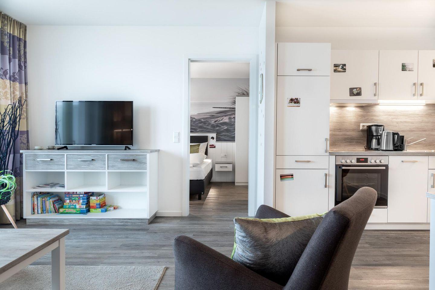 Das lichtdurchflutete und familienfreundliche Nichtraucher-Apartment ist barrierearm und verfügt über Fußbodenheizung, sonnenschutzverglaste und bodentiefe Fensterflächen, kostenfreies WLAN und eine voll ausgestattete offene Küche mit Geschirrspüler, Kühlschrank und Gefrierfach, Kaffeemaschine, Eierkocher, Toaster, Wasserkocher, Herd mit Glaskeramikkochfeld und Backofen.