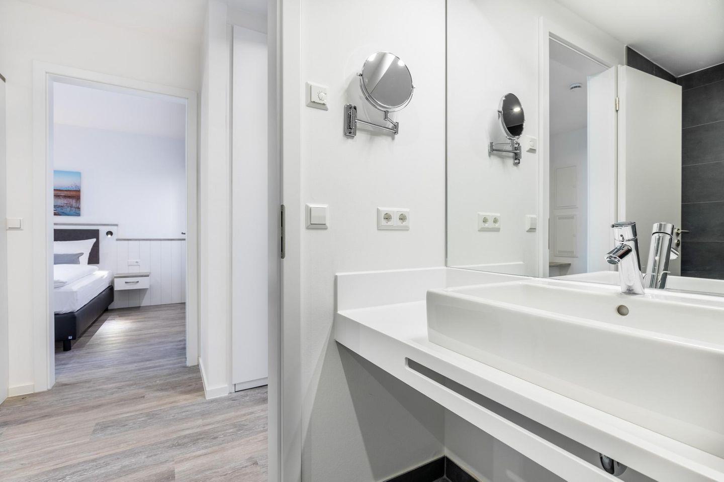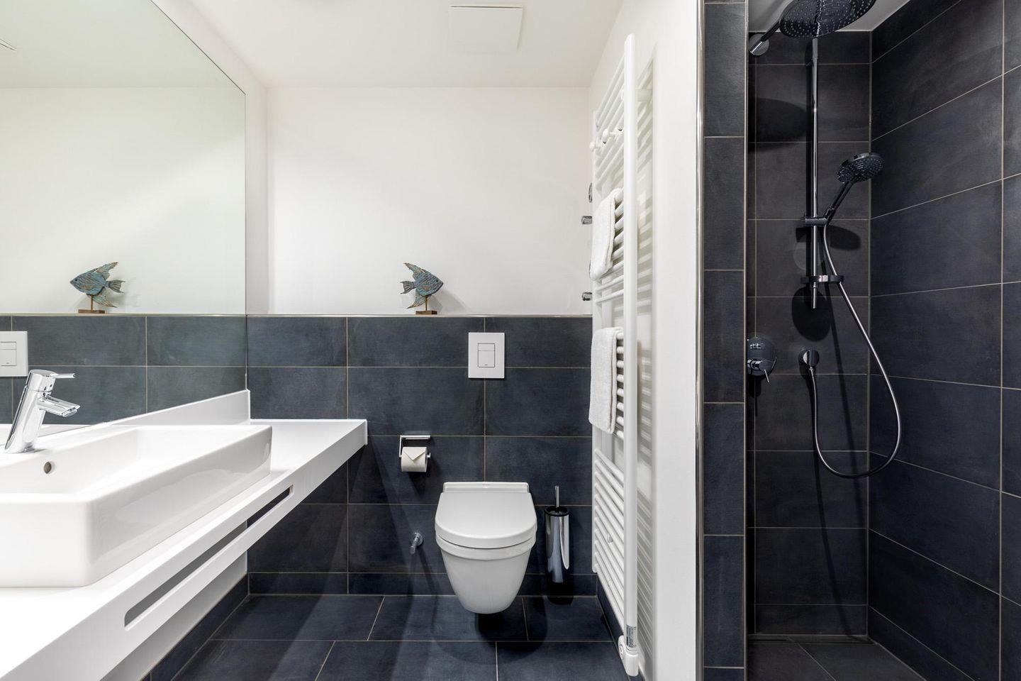 Der modern-behagliche Wohn-Essbereich ist ausgestattet mit einem großen Flatscreen-TV (43 Zoll). Beide separaten Schlafzimmer bieten hohen Schlafkomfort durch jeweils zwei moderne Boxspringbetten (0,90 x 2,00 m) und sind mit jeweils einem Flatscreen-TV (40 Zoll) und Kleiderschrank ausgestattet. Zwei stilvolle Badezimmer bieten eine ebenerdige Regendusche bzw. eine Badewanne, WC, Waschtisch mit Föhn, Handtuchheizkörper und Fußbodenheizung. So beginnt ihr euren Urlaubstag schon morgens ganz entspannt.