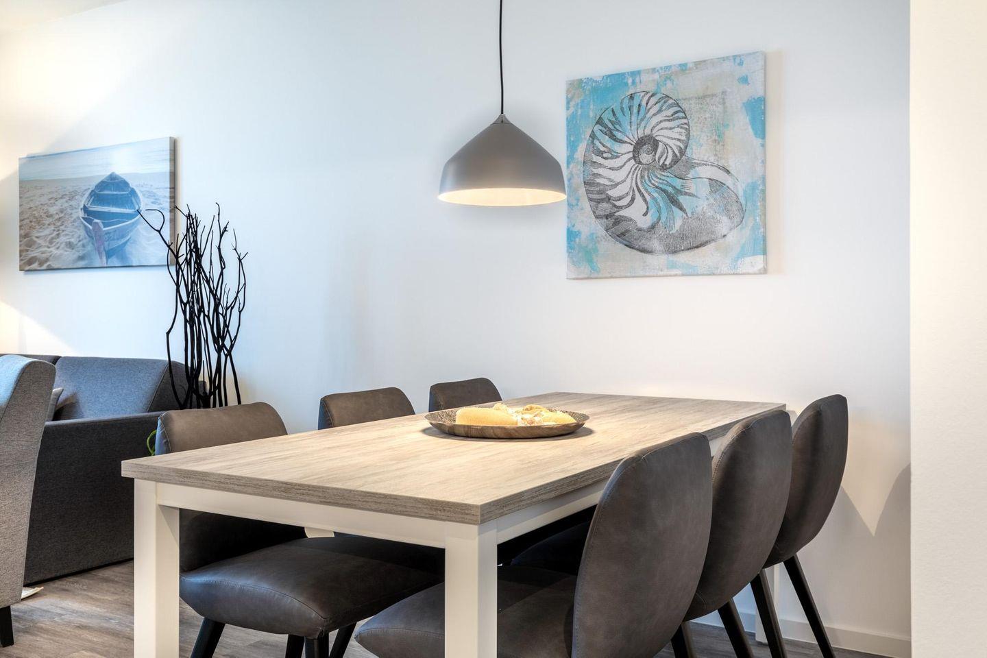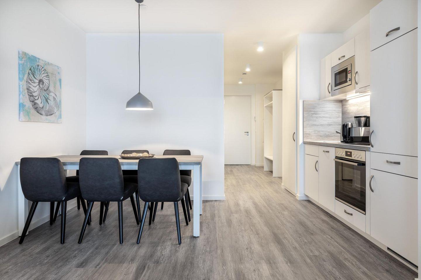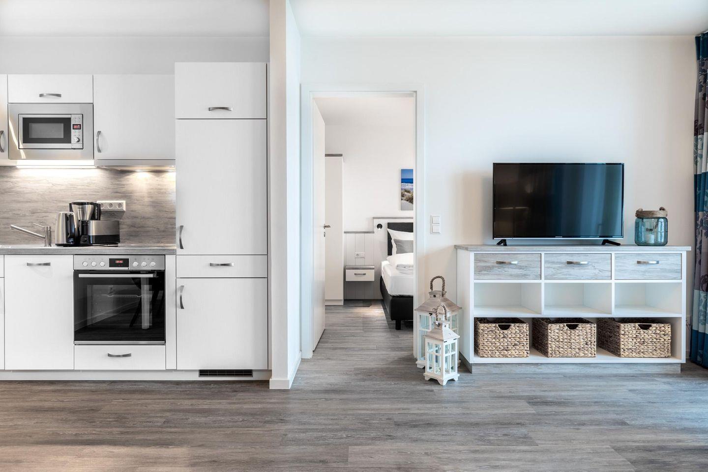 Das lichtdurchflutete und familienfreundliche Nichtraucher-Apartment ist barrierearm und verfügt über Fußbodenheizung, sonnenschutzverglaste und bodentiefe Fensterflächen, kostenfreies WLAN und eine voll ausgestattete offene Küche mit Geschirrspüler, Kühlschrank und Gefrierfach, Mikrowelle, Kaffeefilter- und Kaffeekapselmaschine (Nespresso), Toaster, Handmixer, Wasserkocher, Herd mit Glaskeramikkochfeld und Backofen.