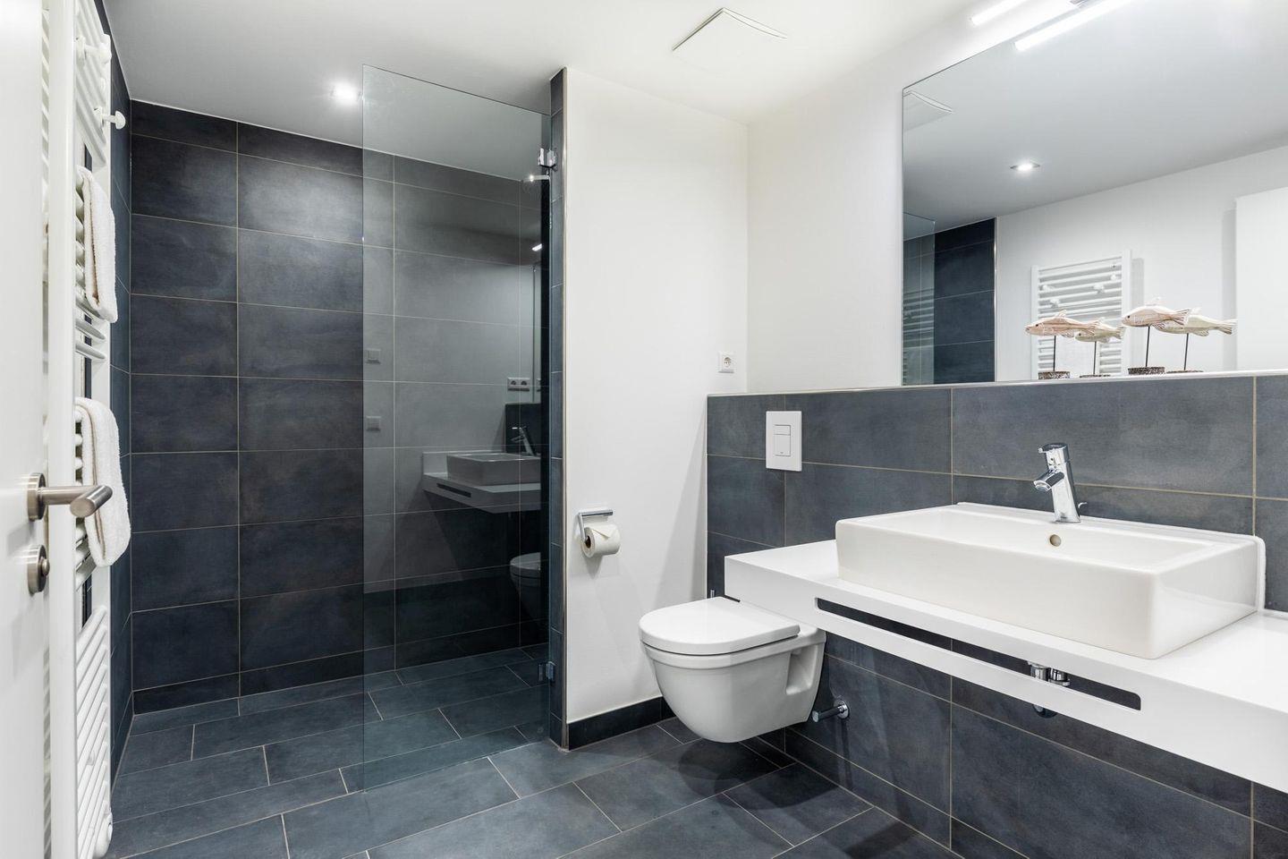 Das stilvolle Badezimmer bietet eine ebenerdige Regendusche, WC, Waschtisch mit Föhn, Handtuchheizkörper und Fußbodenheizung. Des Weiteren beinhaltet die Ferienwohnung ein zweites WC mit Waschbecken.