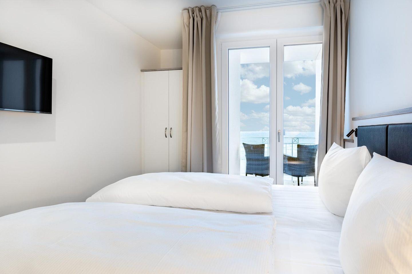 Im modern-behaglichen Wohn-Essbereich befinden sich eine Doppelschlafcouch (1,60 x 1,95 m) und ein großer Flatscreen-TV (43 Zoll). Zwei separate Schlafzimmer bieten hohen Schlafkomfort durch moderne Boxspringbetten mit einem Doppelbett (1,80 x 2,00 m) und sind mit jeweils einem Flatscreen-TV (40 Zoll) und Kleiderschrank ausgestattet. Eines der Schlafzimmer verfügt über einen eigenen, kleinen Balkon mit Meerblick. Bitte beachtet, dass sich zweiten Schlafzimmer ein Brandschutzfenster befindet, dass sich nicht öffnen lässt. Es gibt jedoch eine spezielle Lüftungsanlage, über die stufenweise regulierbar Frischluft zugeführt werden kann.