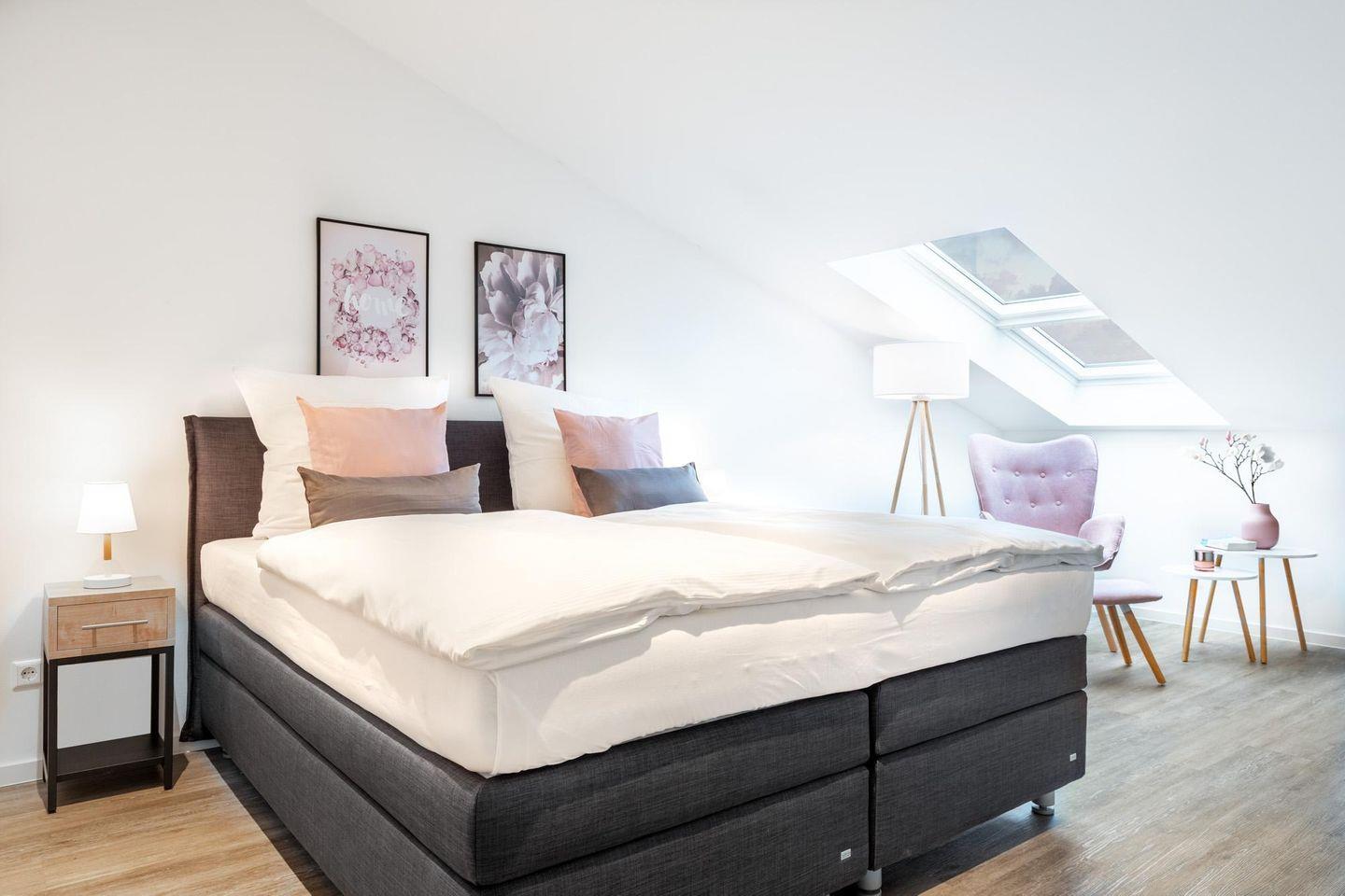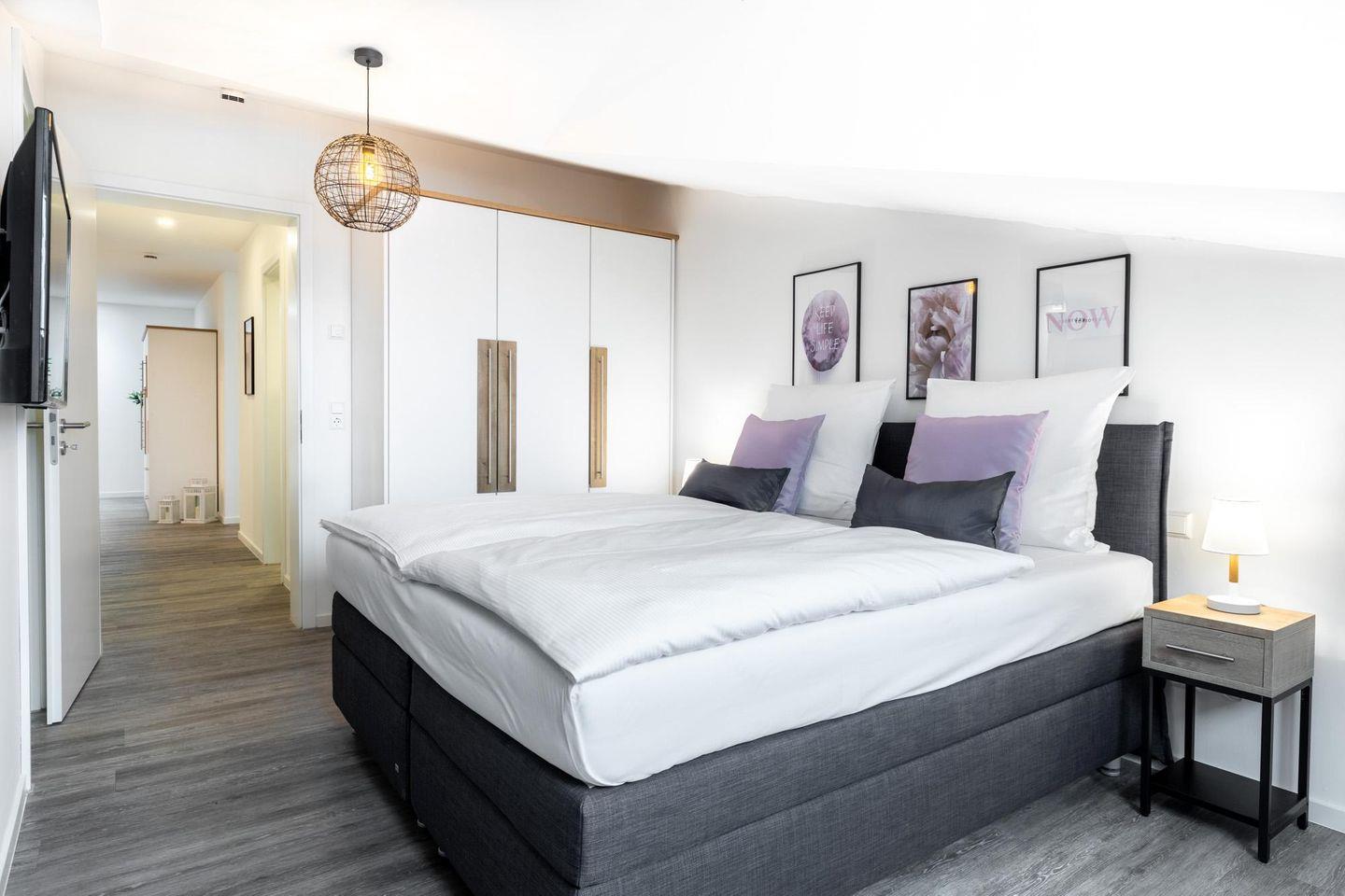 Im modern-behaglichen Wohn-Essbereich befinden sich eine Doppelschlafcouch (1,60 x 1,95 m) und ein großer Flatscreen-TV (43 Zoll). Die beiden separaten Schlafzimmer bieten hohen Schlafkomfort durch jeweils zwei moderne Boxspringbetten (1,80 x 2,00 m) und sind mit jeweils einem Flatscreen-TV (40 Zoll) ausgestattet. Zwei stilvolle Badezimmer bieten eine ebenerdige Regendusche bzw. eine Badewanne, jeweils WC, Waschtisch bzw. Doppelwaschtisch mit Föhn, Handtuchheizkörper und Fußbodenheizung. So beginnt euer Urlaubstag schon morgens vollkommen entspannt. Das größere der beiden Badezimmer ist direkt mit einem der beiden Schlafzimmer verbunden. Des Weiteren verfügt das Apartment über einen Abstellraum, der vom Entree aus zugänglich ist.