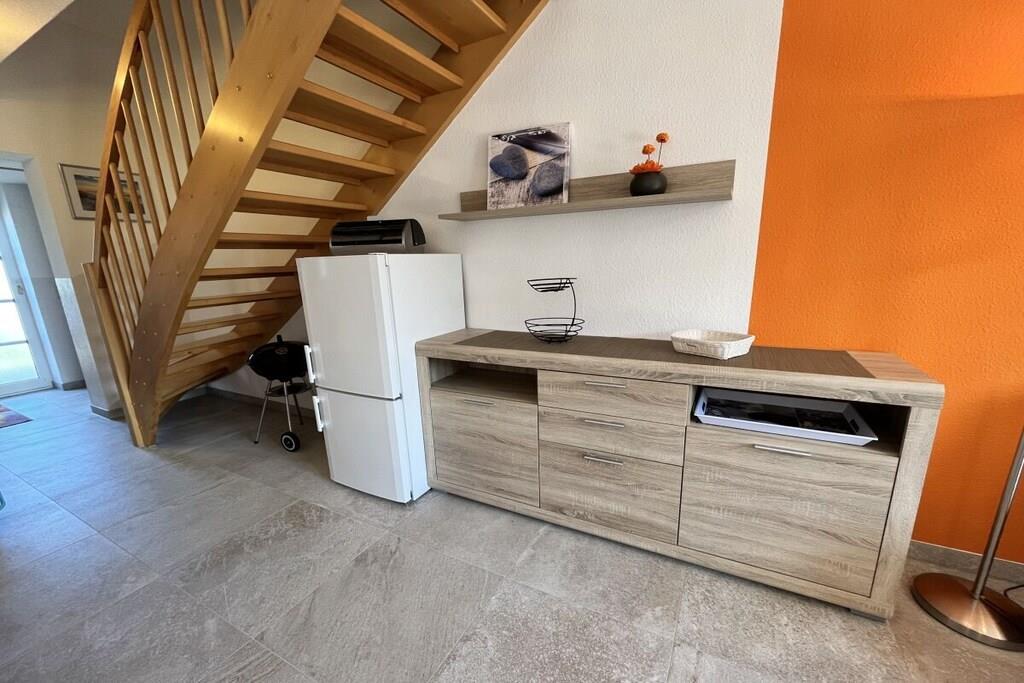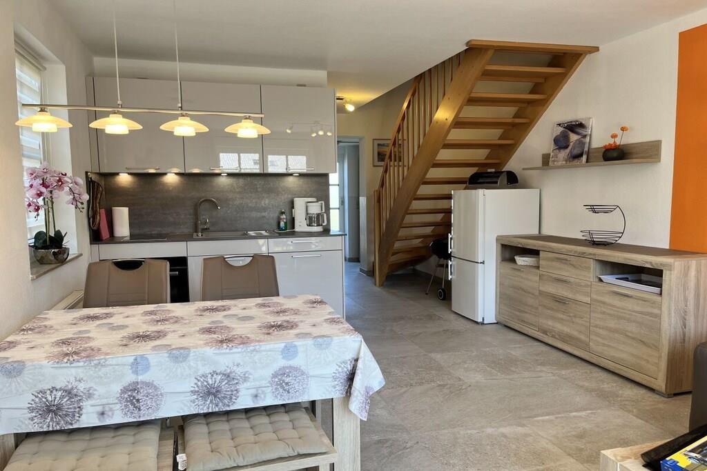Natur & Komfort vereint Ihr Feriendomizil in Zingst ist ein Ferienhaus mit möblierter Terrasse, 2 Schlafzimmern mit jeweils einem Doppelbett in der oberen Etage. Im unteren Bereich erwartet Sie der Eingangsbereich, das moderne Bad, sowie ein offener Wohn-/Essbereich mit komplett eingerichteter Küche, einem Esstisch und einer separater Couchecke mit Flachbild TV (Satanlage). Die Ferienwohnung wurde komplett neu saniert und ist modern neu eingerichtet. Das Badezimmer hat eine ebenerdige Dusche mit einem großen modernem Waschtisch mit beleuchtetem Spiegel. Die Apartmentanlage liegt in unmittelbarer Nähe vom Bodden und der Hafen ist nicht weit entfernt. Für ihren Aufenthalt steht ihnen direkt am Haus ein Pkw-Stellplatz zur Verfügung.