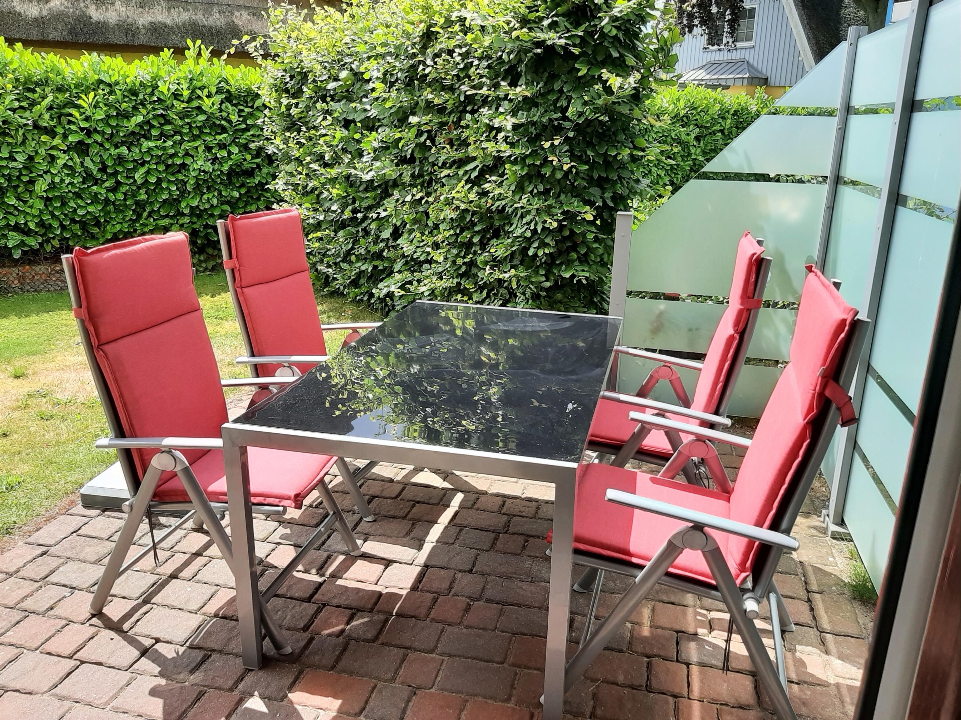 Besonders beliebt bei den Gästen der Ferienwohnung: die schöne Terrasse, mit eingezäuntem und abschließbarem Gartenanteil. Ideal für Hundehalter.