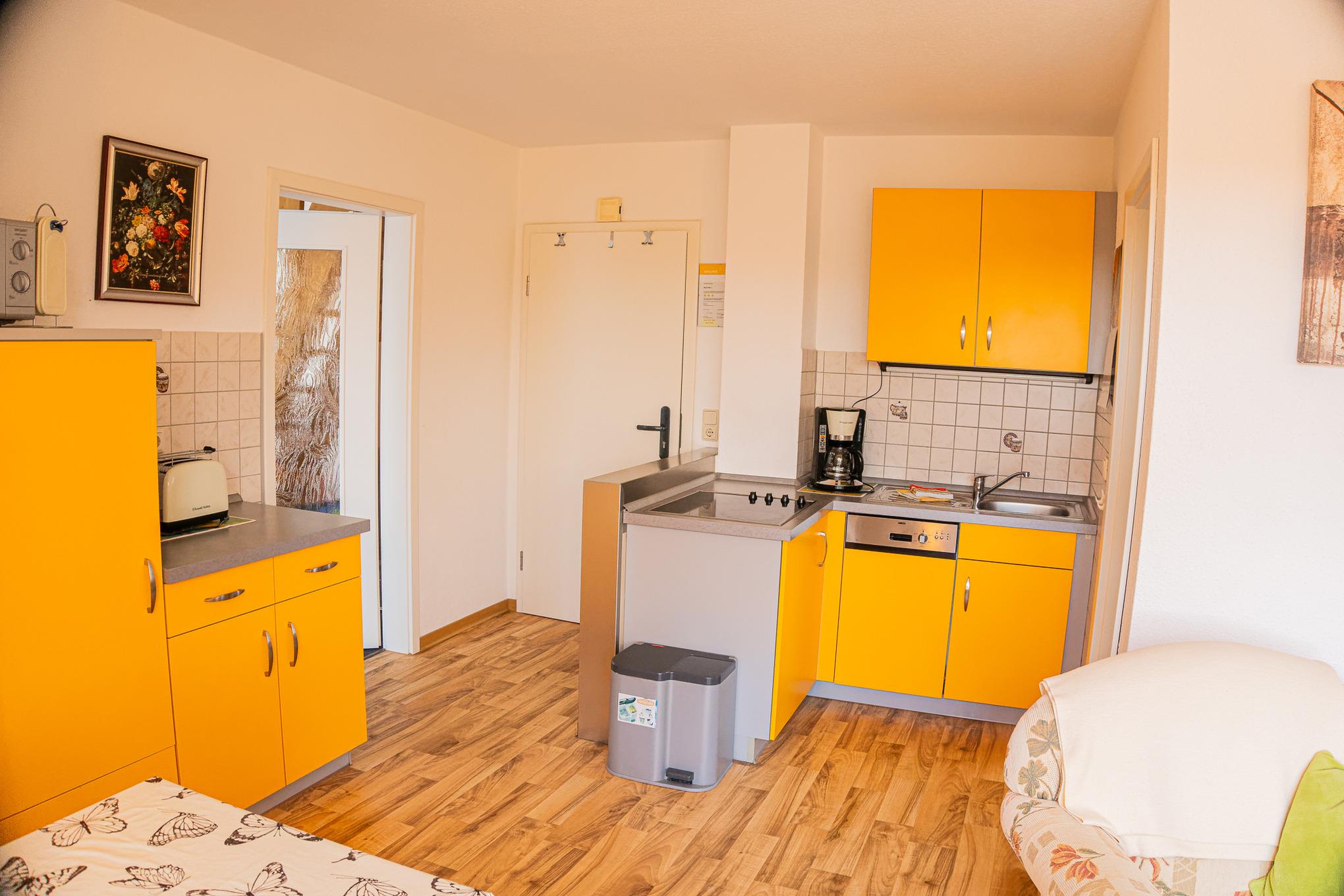 Die gut ausgestattete Küche besitzt unter anderem einen Kühlschrank, einen Herd zum Kochen und sogar eine Spülmaschine.