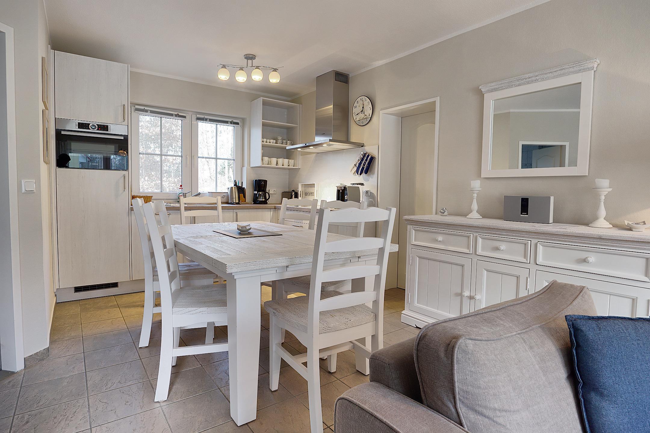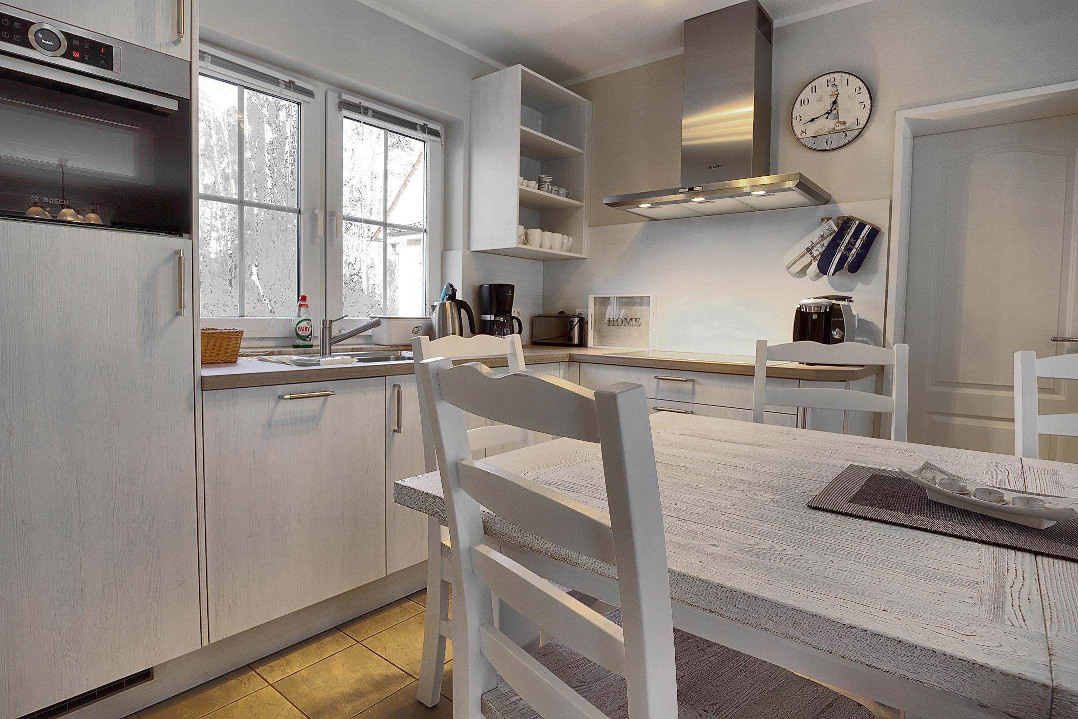 Die gut ausgestattete Küche besitzt unter anderem einen Kühlschrank, einen Herd zum Kochen und sogar eine Spülmaschine.