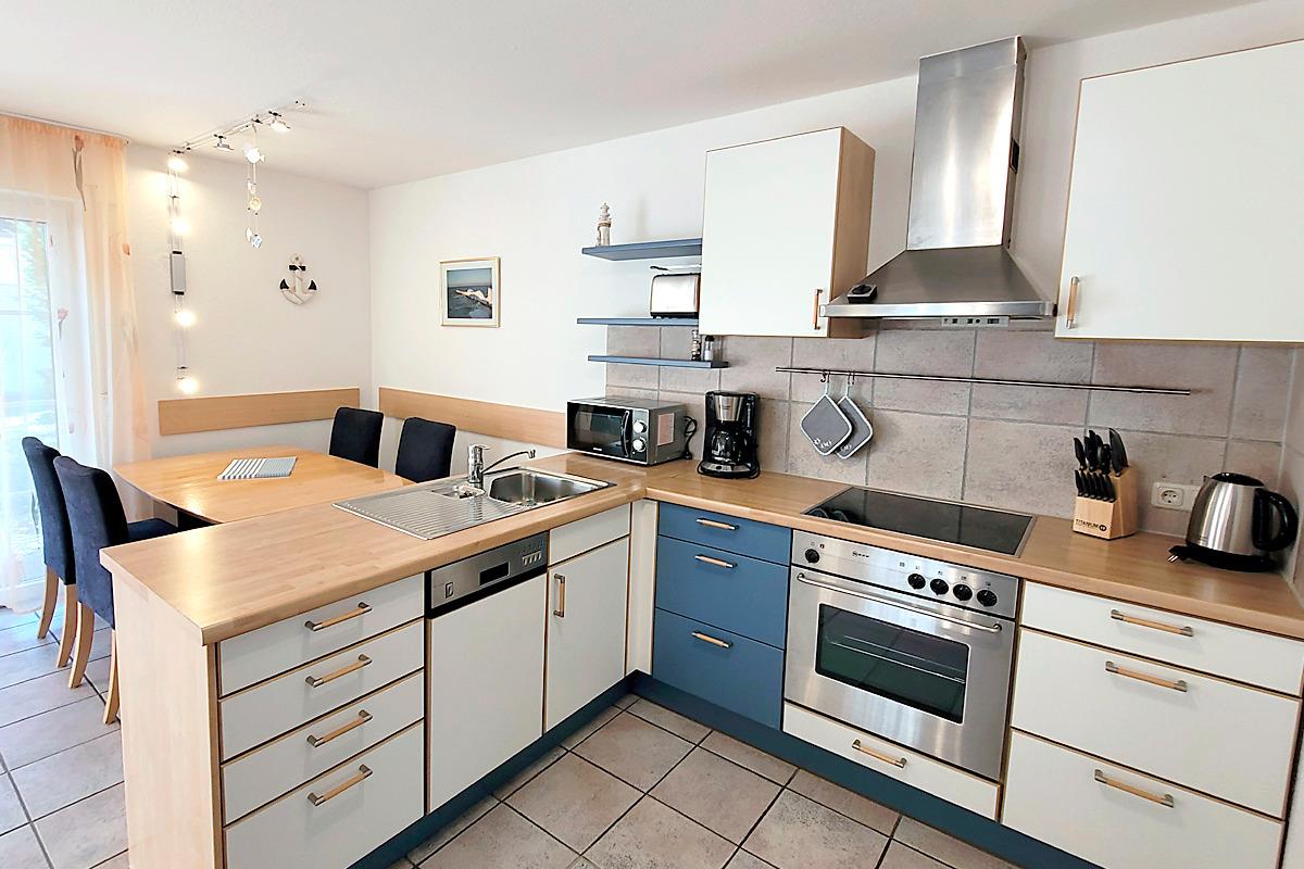 Die gut ausgestattete Küche besitzt unter anderem einen Kühlschrank, einen Herd zum Kochen, eine Mikrowelle und sogar eine Spülmaschine.