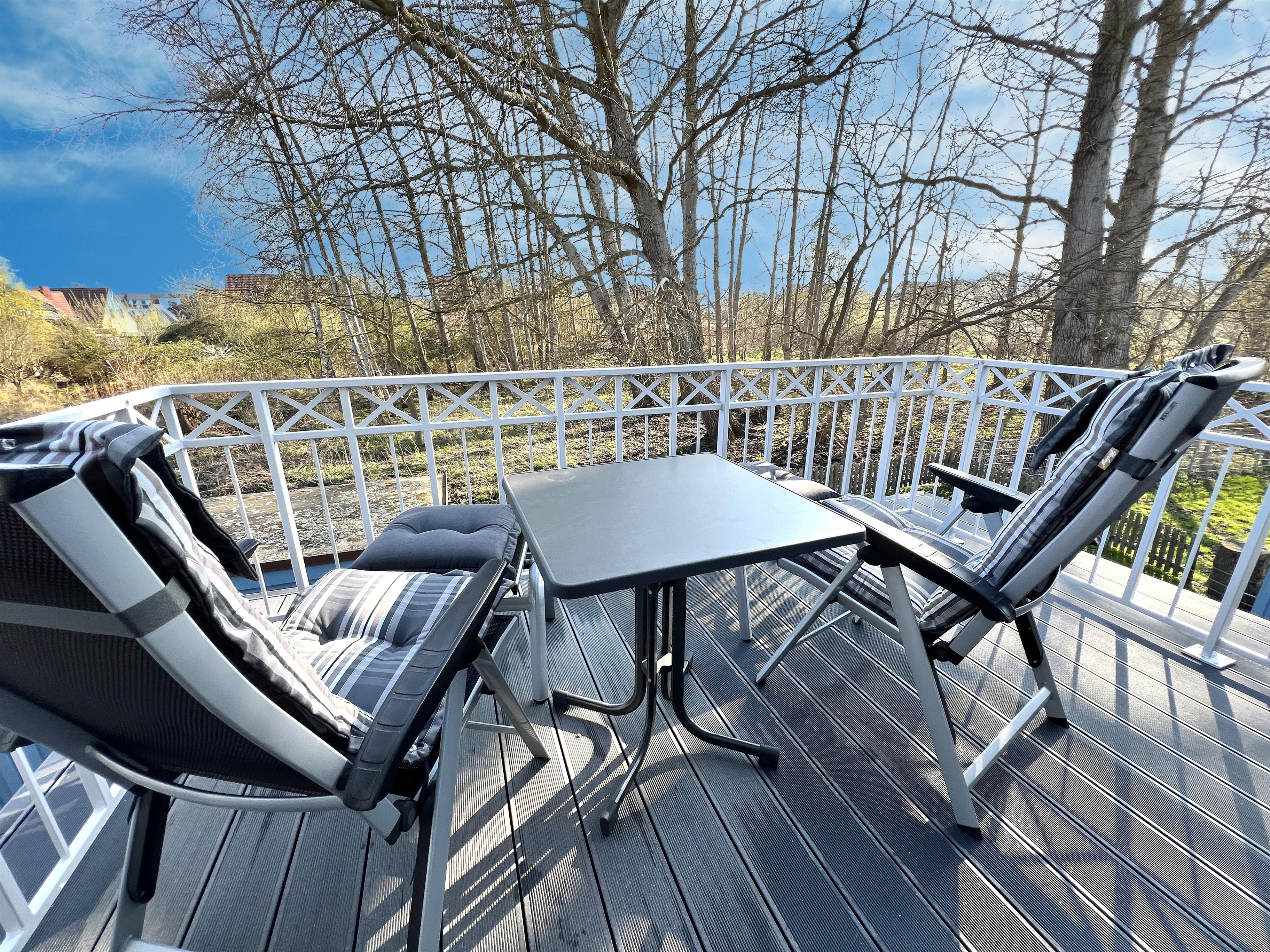 Sie bietet für 2Personen ein gemütliches Ambiente und ist liebevoll und hochwertig eingerichtet. Im Wohnzimmer sorgt ein 55"- Flachbildschirm für Fernseh-Vergnügen, das Schlafzimmer verwöhnt Sie mit einem 50"- Flachbildschirm. Ein Kaminofen im Wohnzimmer sorgt für behagliche Wärme an kalten Tagen. Das exklusive Bad ist mit einer Fußbodenheizung ausgestattet. Die Wohnung besitzt 2 große Balkone ( Süd - und Westlage ) mit Blick ins Grüne. Beide Balkone sind mit bequemen, verstellbaren Klappstühlen mit Liegefunktion, Fußhocker, Tisch und Sonnenschirm ausgestattet. Ebenfalls zur Wohnung gehört ein eigener Abstellraum für Fahrräder und Strandutensilien. Kostenloser WLAN-Anschluß.