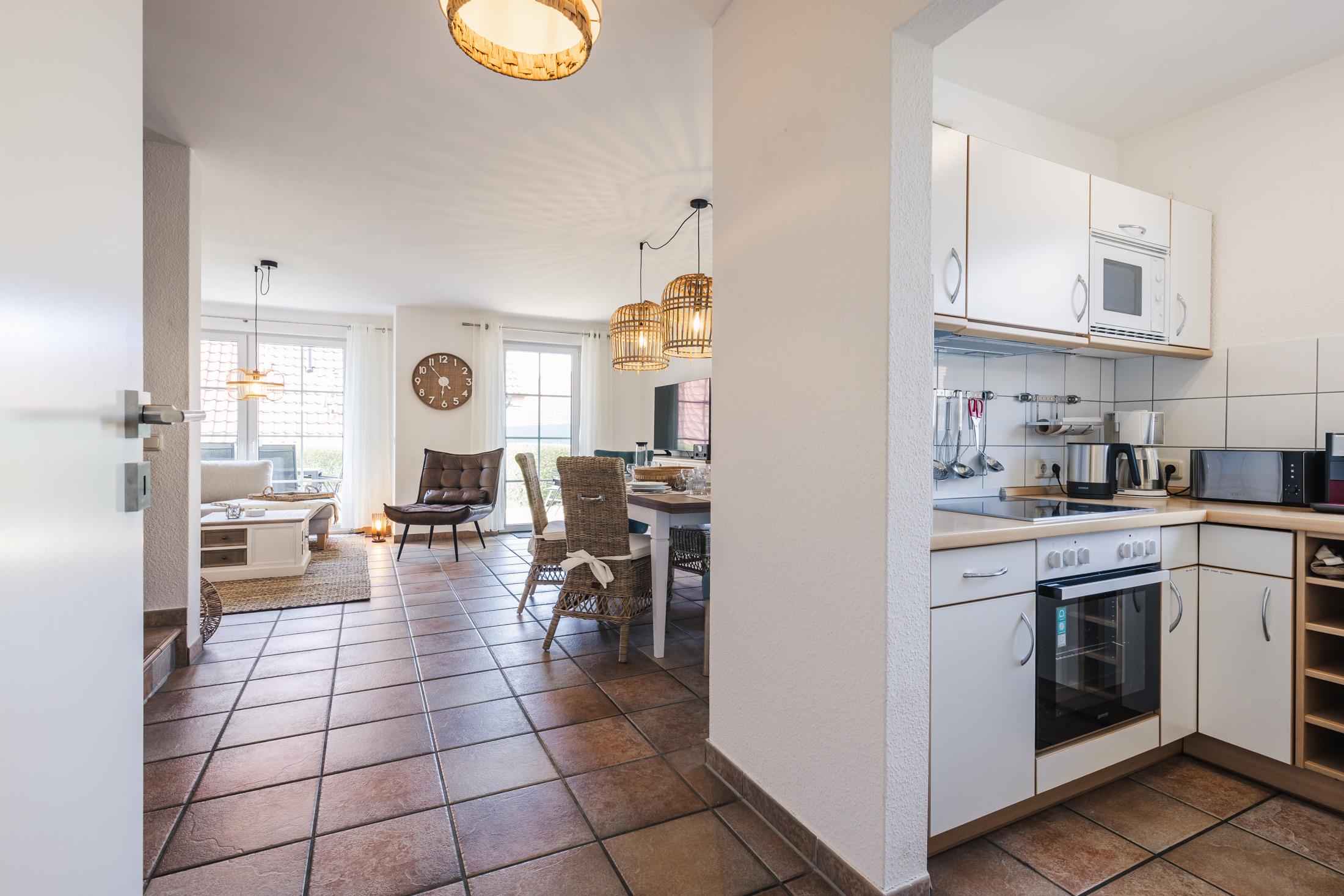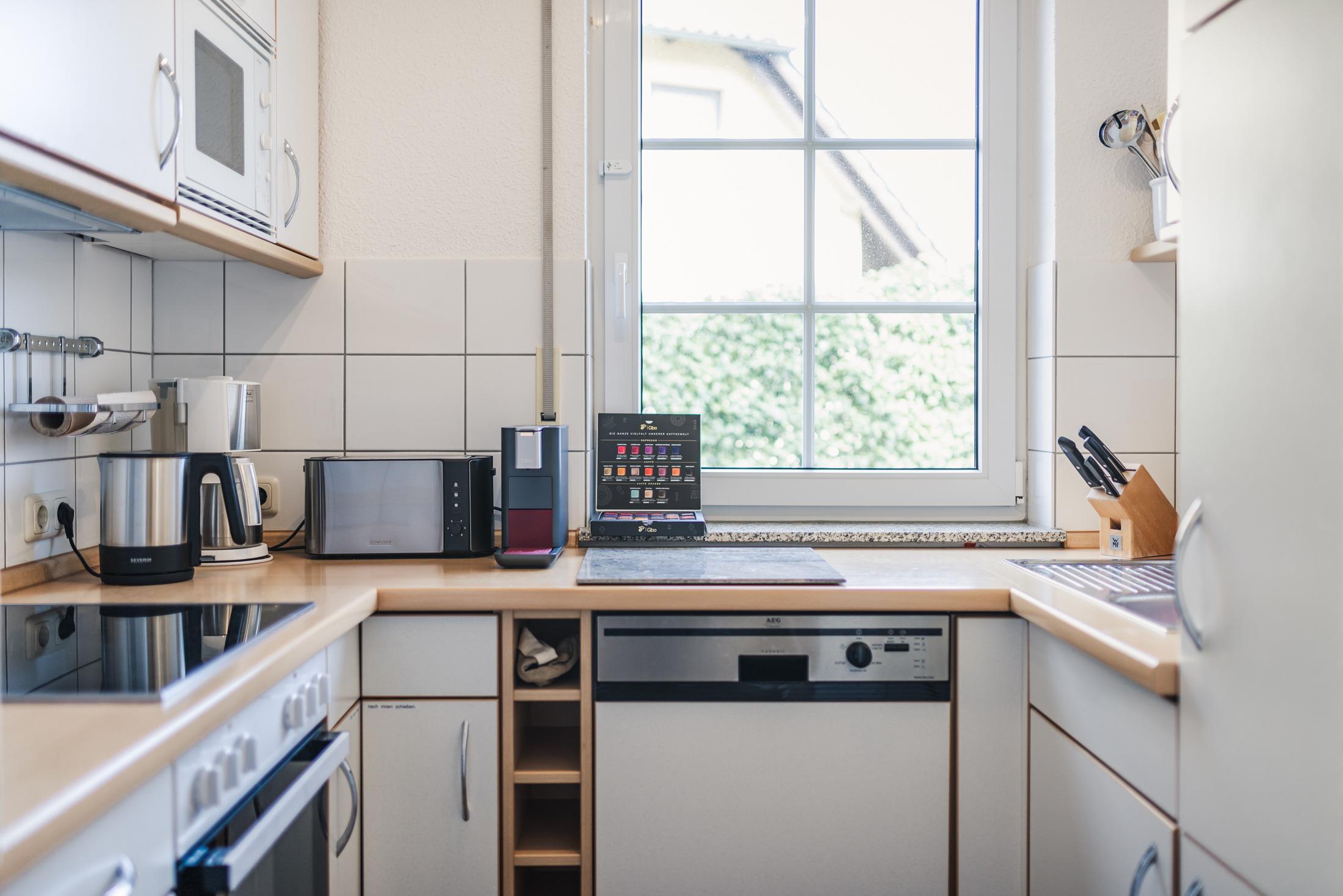 In der gut ausgestatteten Küche finden Sie neben einem Kühlschrank auch eine Mikrowelle und einen Backofen. Und eine Waschmaschine und ein Trockner stehen kostenfrei zur Verfügung.