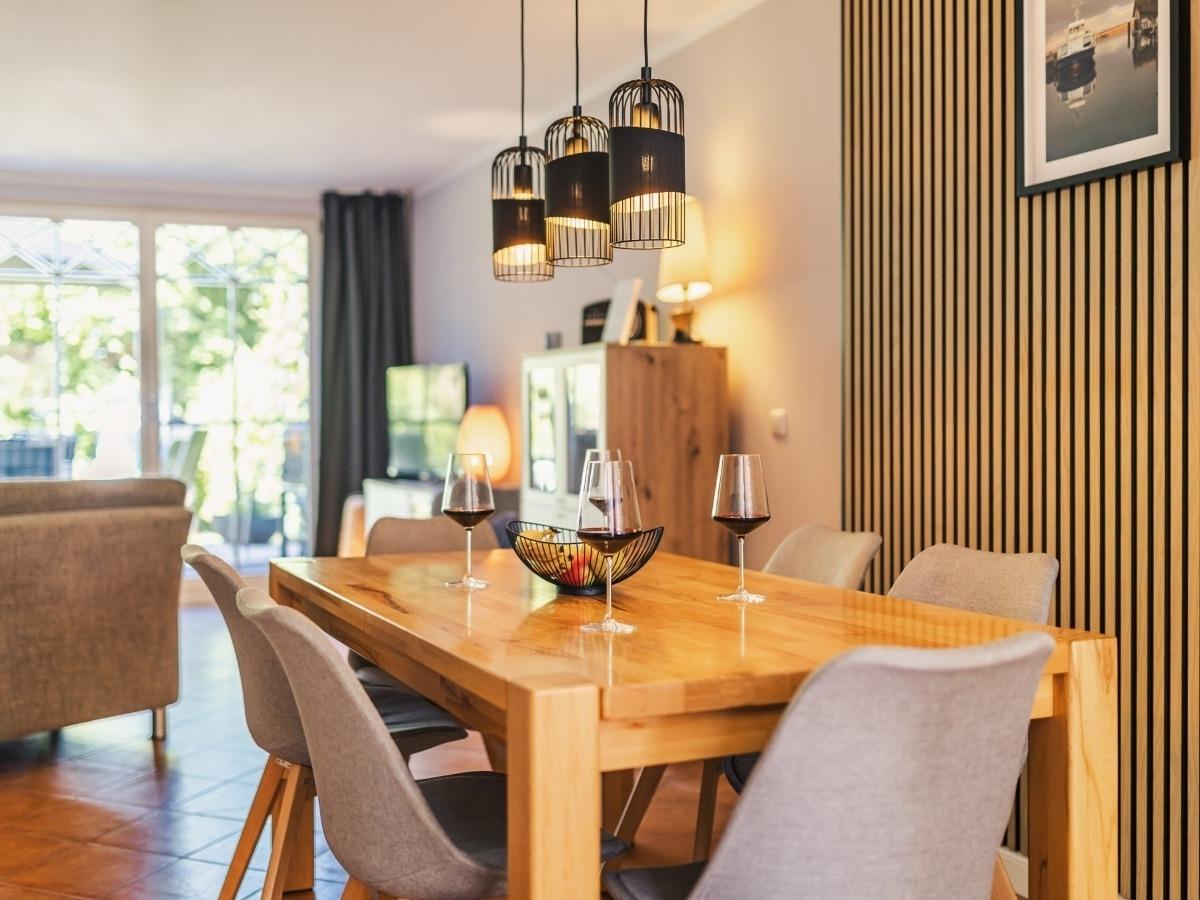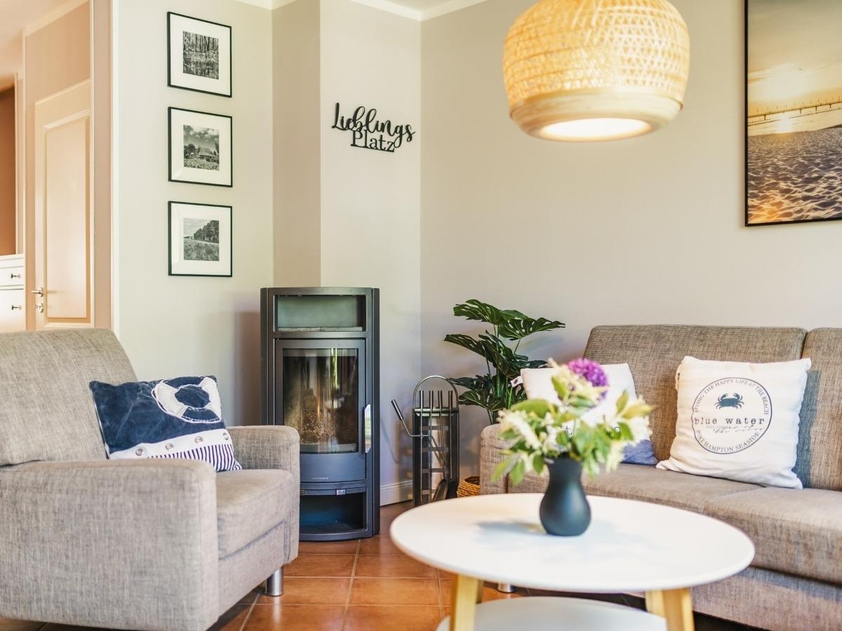 Für die kalte Jahreszeit sorgen ein gemütlicher Kaminofen sowie eine Fußbodenheizung im EG und OG für behagliche Urlaubsatmosphäre. Vom lichtdurchfluteten Wohnbereich haben Sie einen direkten Zugang zur Terrasse mit angeschlossenem Garten.