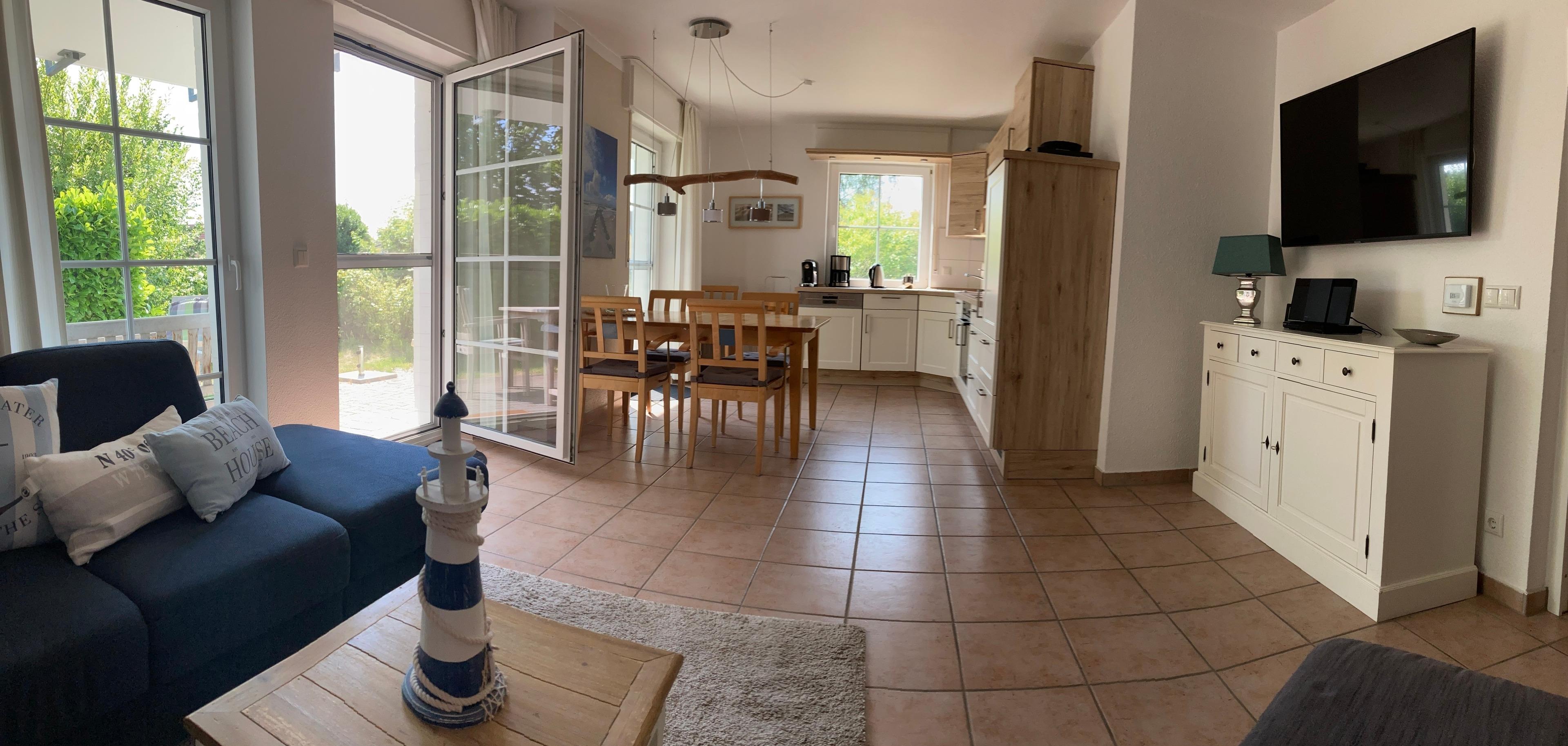 Perfekt gelegene und lichtdurchflutete 68 qm große 3 Zi. EG-Wohnung; ausgezeichnet mit 4 Sternen vom Deutschen Tourismusverband. Absolut ruhige Lage und dennoch nur 50 m zum Strand u. 300 m zum Kurhaus. Die anspruchsvolle Innenausstattung entspricht einem hohen Anforderungsstandard. Aus der offenen Küche mit dem kombinierten WohnEsszimmer haben Sie mehrere Zugänge zur großen Süd-Terrasse und Garten mit Esstisch, Liegestühlen sowie Grillmöglichkeit. Modernes Bad mit Raindance-Dusche, 2 WC's; Wohn- und Schlafzimmer jeweils mit TV Flatscreens. Auch für Familien ein kinderfreundliches Feriendomizil mit separatem Kinderreisebett und Kinderhochstuhl.