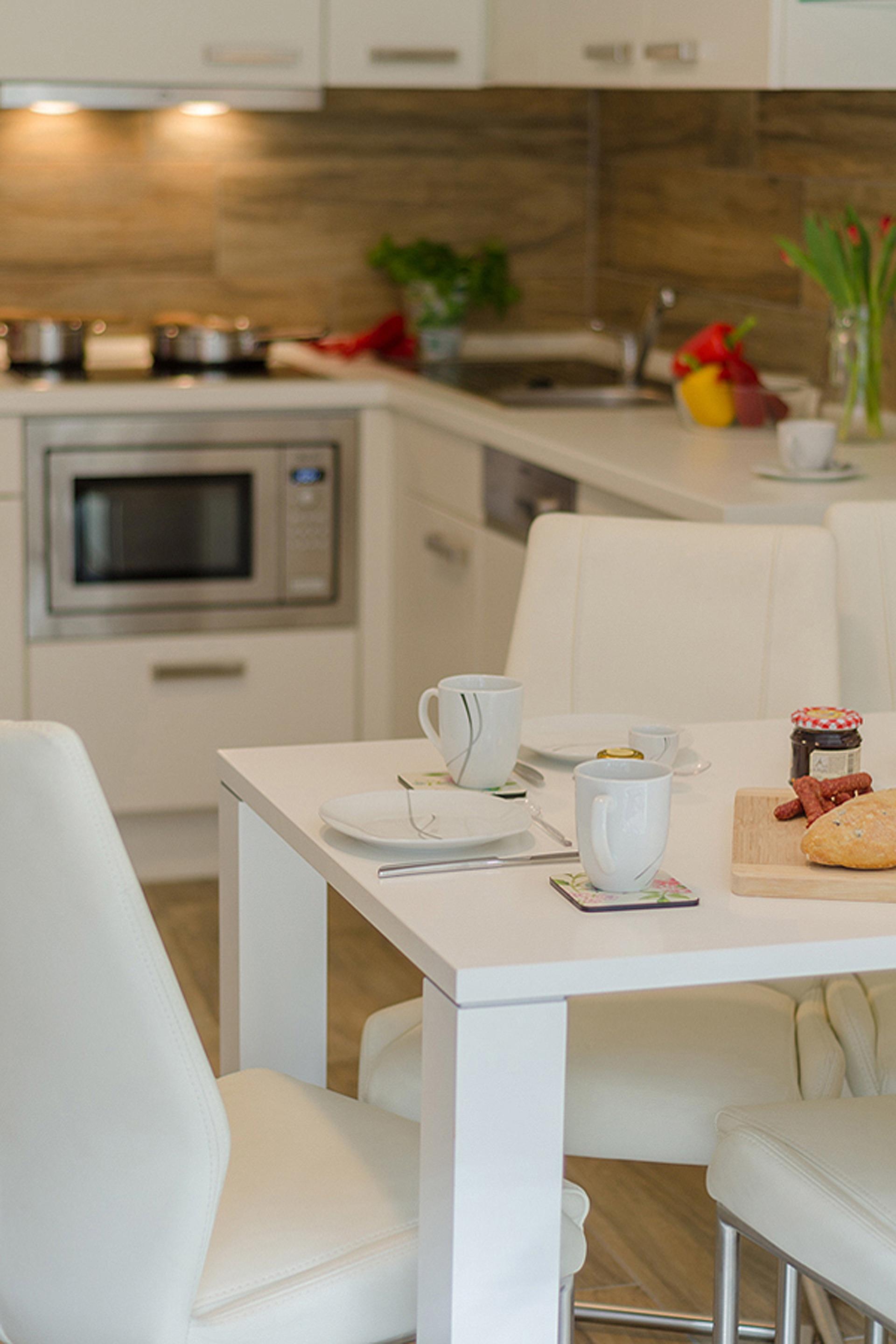Die gut ausgestattete Küche besitzt unter anderem einen Kühlschrank, einen Herd zum Kochen und sogar eine Spülmaschine.
