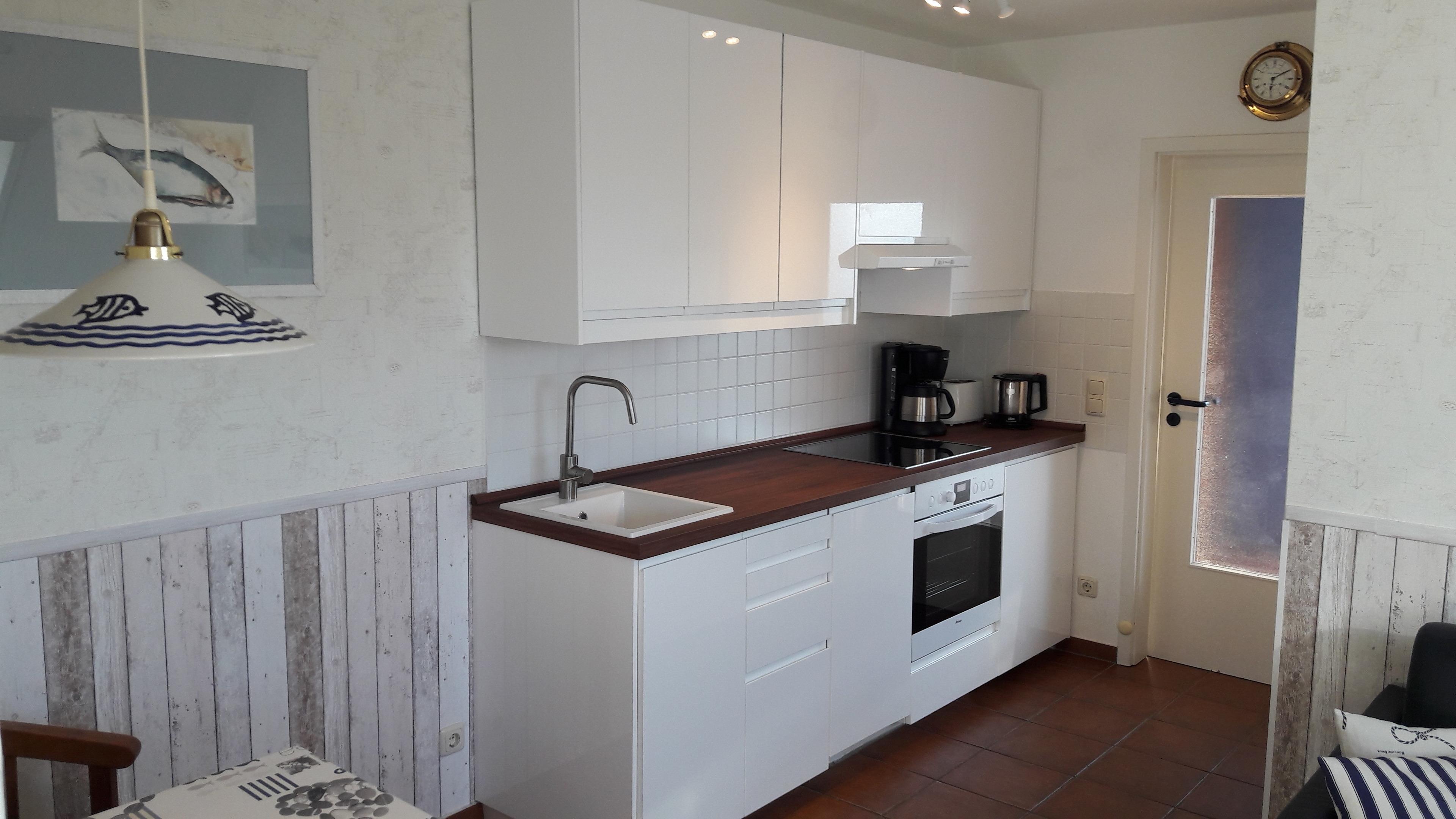 Die gut ausgestattete Küche besitzt unter anderem einen Kühlschrank, einen Herd zum Kochen und sogar eine Spülmaschine.