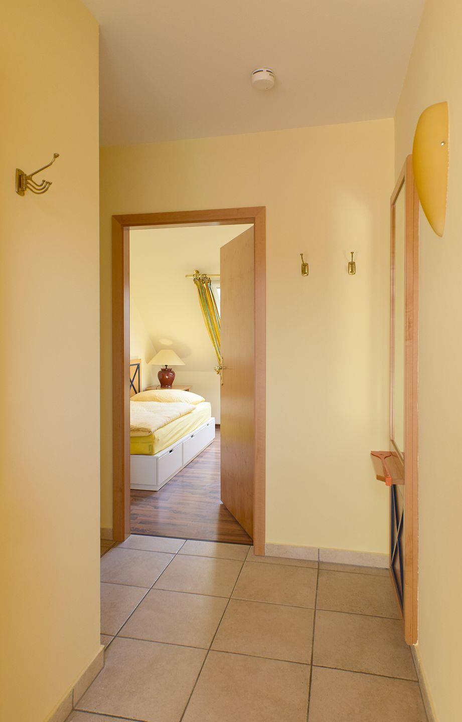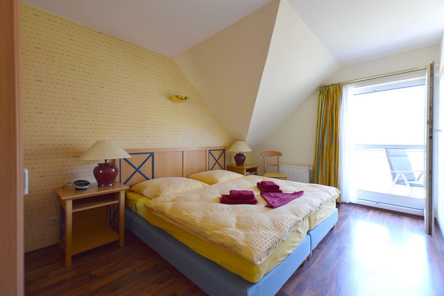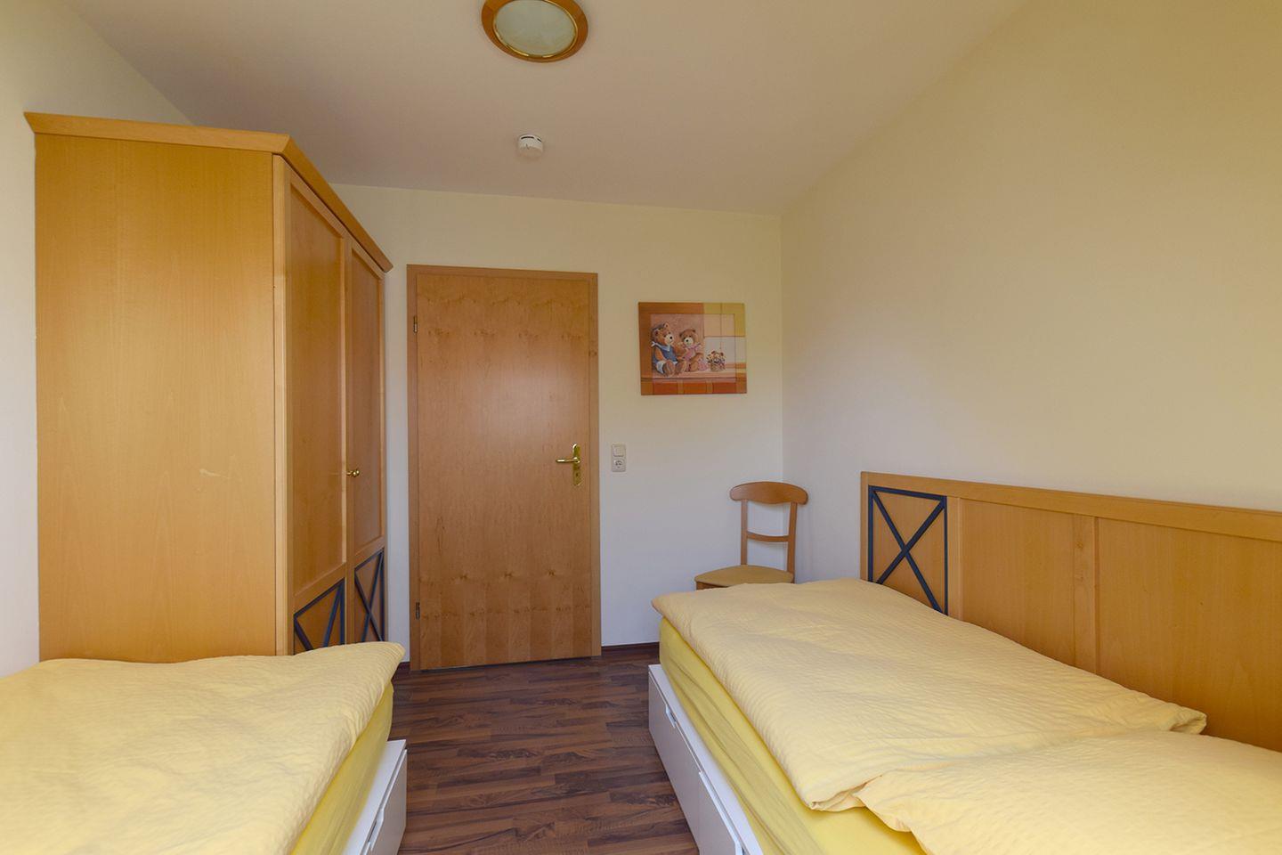 Die Wohnung bietet zwei Schlafzimmer: Das erste Schlafzimmer ist mit einem Doppelbett (200 x 200 cm) ausgestattet, das zweite Schlafzimmer mit zwei Einzelbetten (90 x 200 cm). Ein Badezimmer mit Badewanne und WC rundet das Angebot ab.