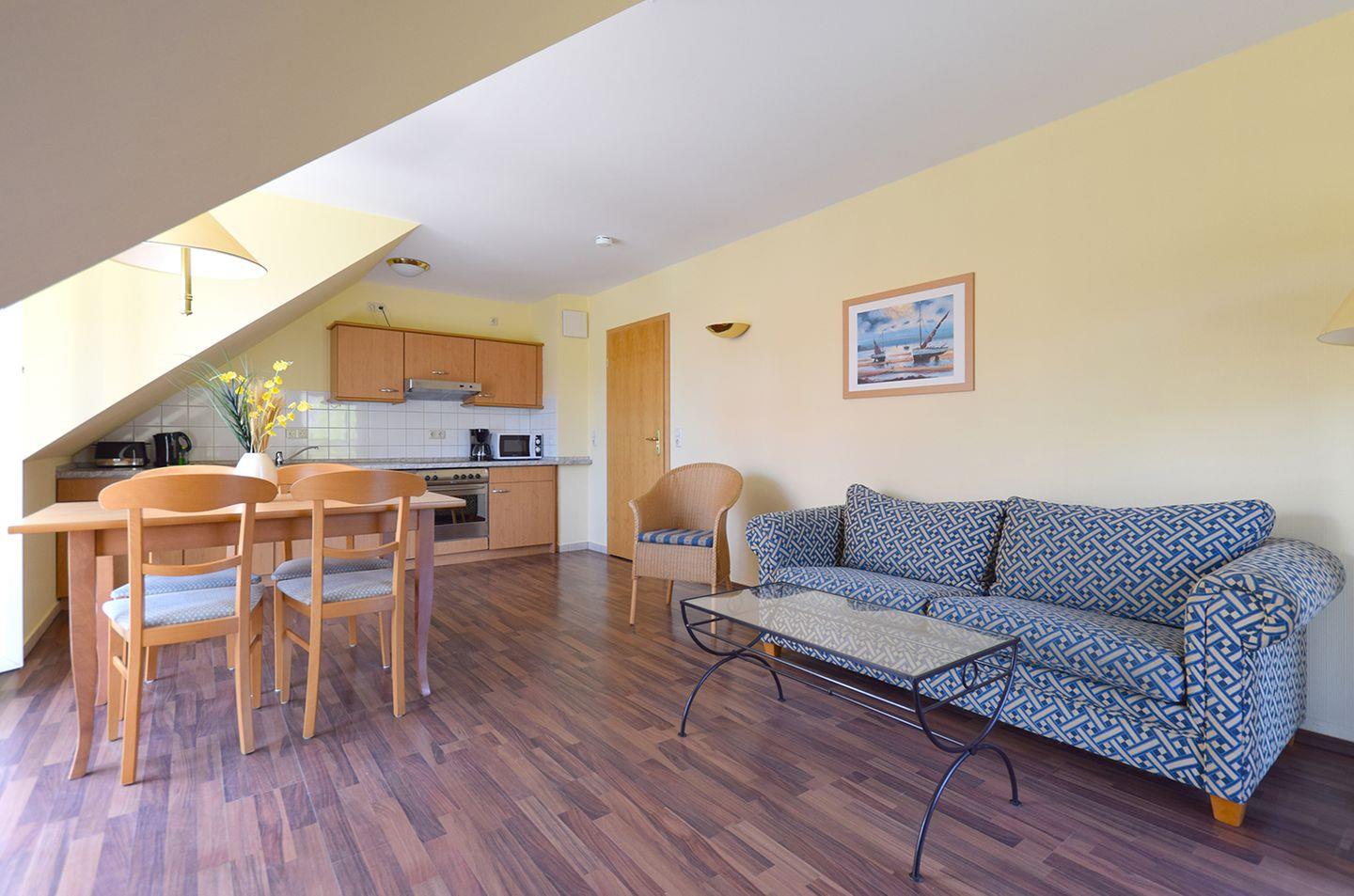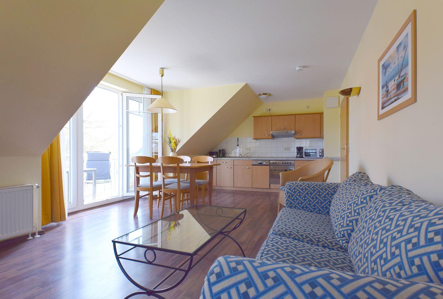 Diese komfortable Ferienwohnung für bis zu 4 Personen befindet sich im 2. Obergeschoss eines modernen Hauses und bietet eine Wohnfläche von ca. 74 m². Ein Fahrstuhl sorgt für bequemen Zugang zur Wohnung. Der großzügige Wohn-/Essbereich ist mit einer gemütlichen Sitzgarnitur, SAT-TV und einem Radio ausgestattet. Der Essbereich bietet Platz für bis zu 6 Personen. Die offene Küchenzeile verfügt über einen Kühlschrank mit Gefrierfach, ein Cerankochfeld, einen Backofen, Geschirrspüler, Kaffeemaschine, Toaster und Wasserkocher – ideal für die Zubereitung von Mahlzeiten.