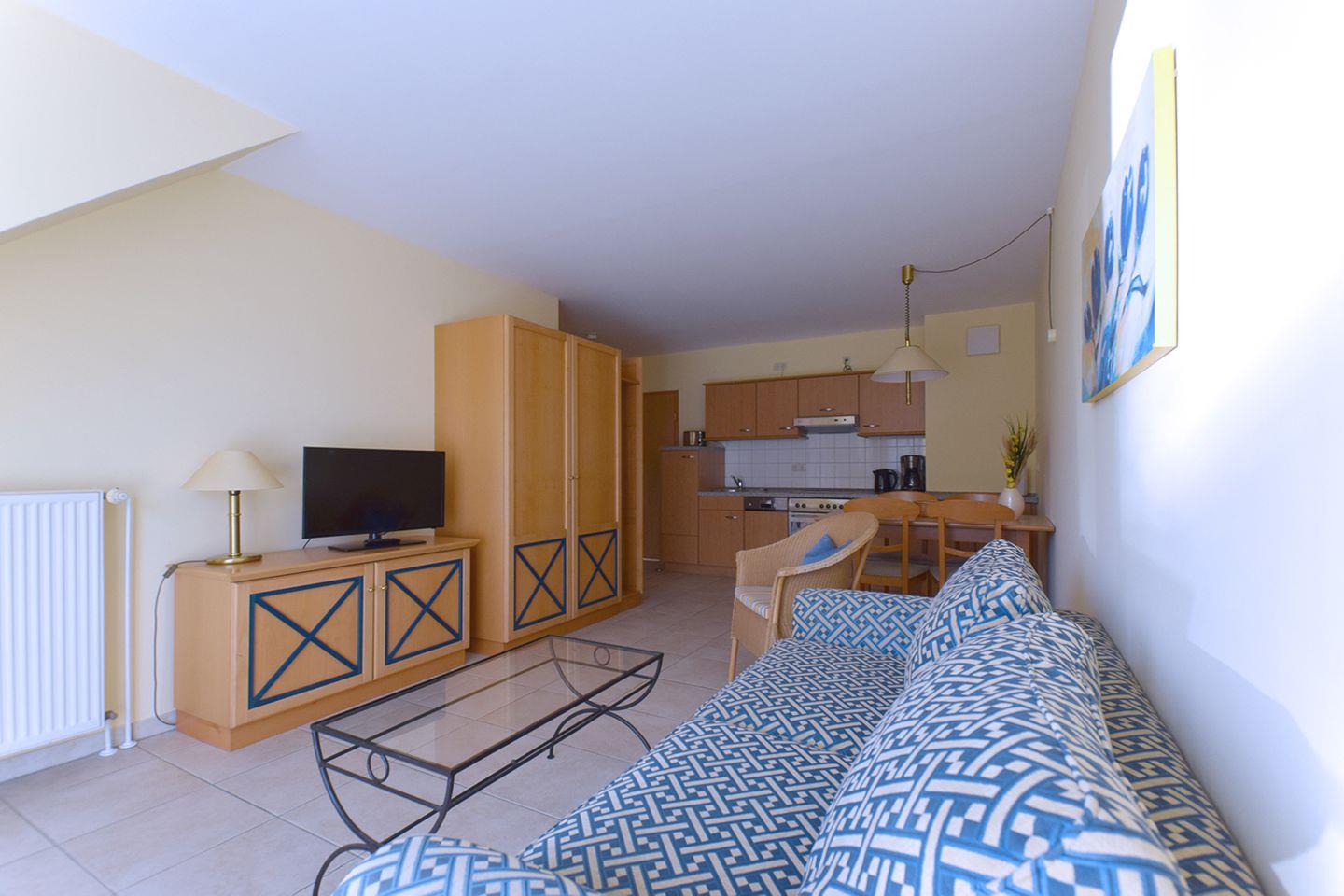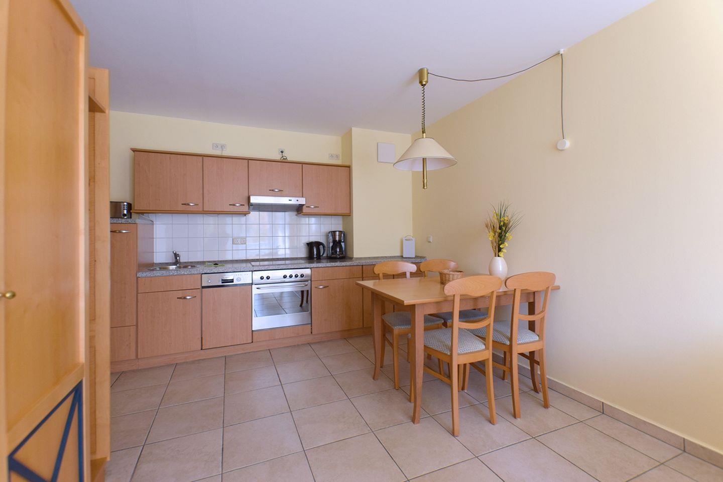 Diese gemütliche Ferienwohnung für bis zu 2 Personen befindet sich im 2. Obergeschoss eines modernen Hauses und bietet eine Wohnfläche von ca. 48 m². Ein Fahrstuhl ermöglicht den bequemen Zugang zur Wohnung. Der Wohnbereich ist mit einer komfortablen Sitzgarnitur, SAT-TV und einem Radio ausgestattet. Der Essbereich bietet Platz für 4 Personen. Die integrierte Küchenzeile enthält alle wichtigen Geräte wie einen Kühlschrank mit Gefrierfach, ein Cerankochfeld, einen Backofen, Geschirrspüler, Kaffeemaschine, Toaster und Wasserkocher – ideal für die Zubereitung kleiner Mahlzeiten.