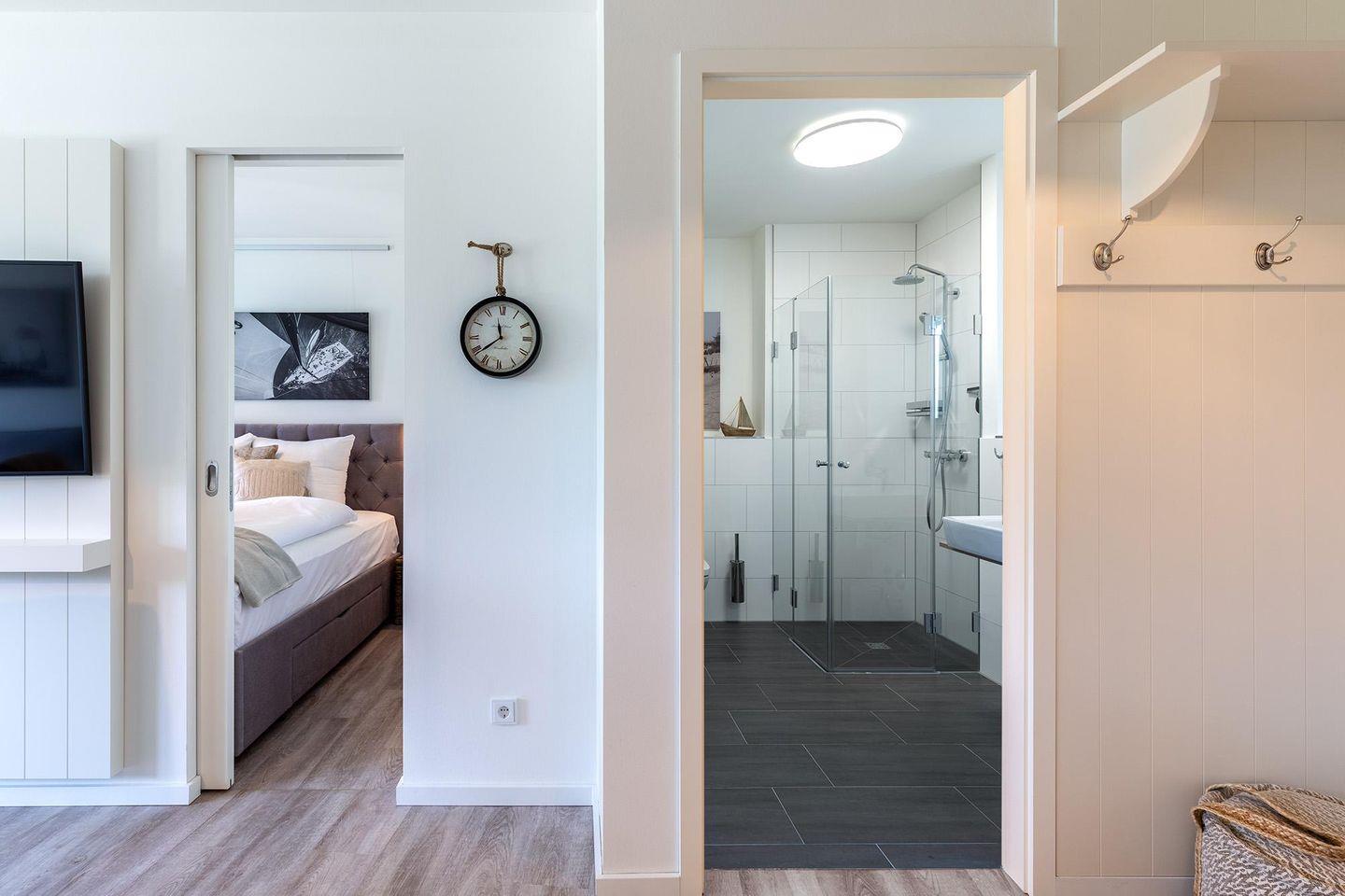 Das helle und moderne Nichtraucher-Studio verfügt über Fußbodenheizung, sonnenschutzverglaste Fenster, kostenfreies WLAN und eine voll ausgestattete offene Küche mit Geschirrspüler, Gefrier- und Kühlschrankkombination, Kaffeemaschine, Toaster, Wasserkocher, Mikrowelle, Herd mit Glaskeramikkochfeld und Backofen sowie über einen behaglichen Wohn-Essbereich. Im Wohnbereich befindet sich eine Doppelschlafcouch (1,40 x 2,00 m) und ein großer SMART-TV. (50 Zoll). Der Studiocharakter des Apartments begründet sich darin, dass der Schlafbereich durch Schiebetüren vom Wohnbereich auf Wunsch trennbar ist. Das Schlafzimmer verfügt ebenfalls über einen SMART-TV (43 Zoll). Ein modernes Boxspringbett (1,60 x 2,00 m) bietet hohen Schlafkomfort. Im stilvollen Badezimmer stehen euch eine ebenerdige Dusche, WC, Waschtisch mit Föhn, Handtuchheizkörper und Fußbodenheizung zur Verfügung. Entspannte, sonnige Stunden verbringt ihr auf der überdachten und mit Gartenmöbeln ausgestatteten Loggia. Die Loggia ist vom Wohn- als auch vom Schlafbereich aus zugänglich.
