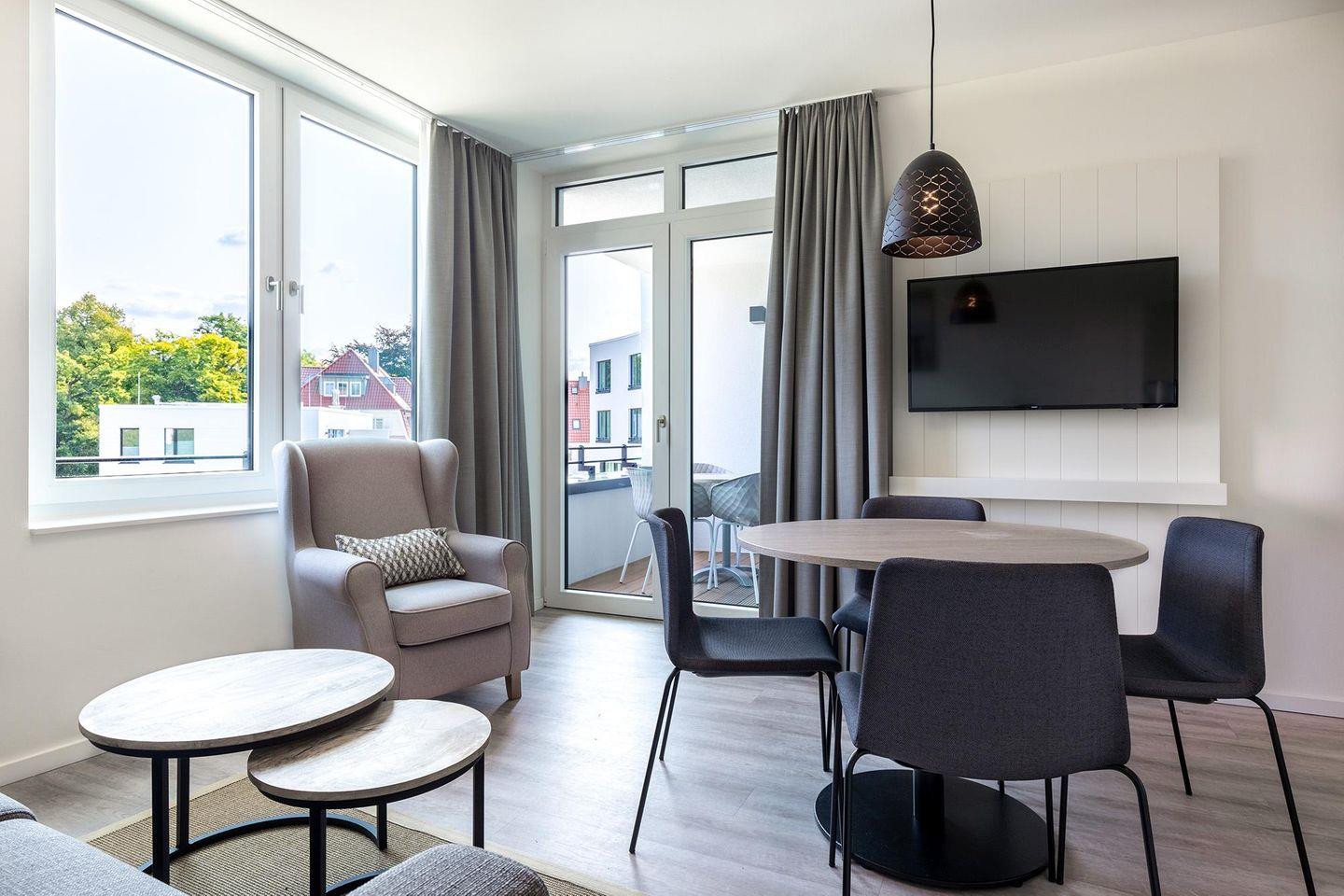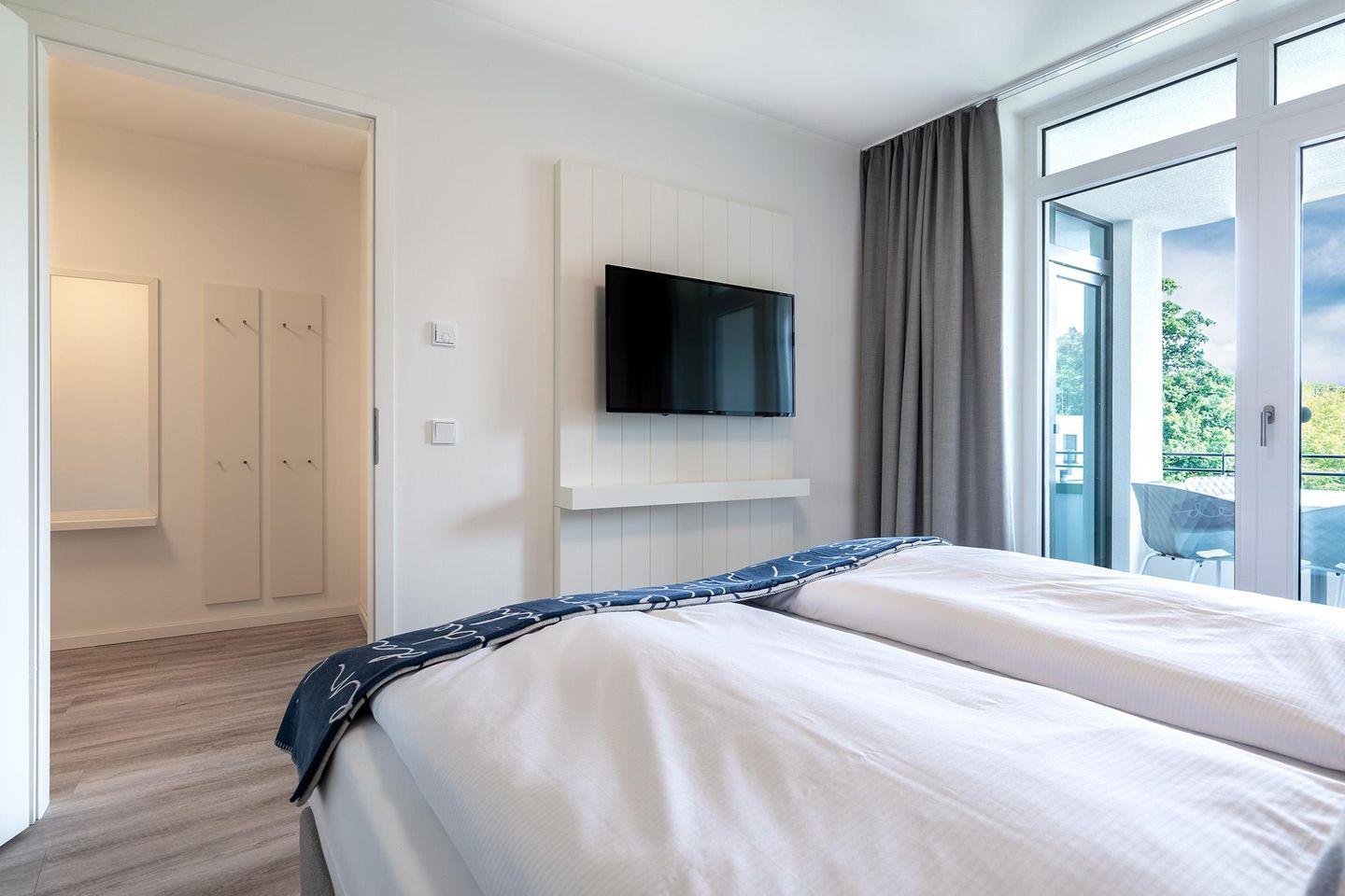 Das helle und moderne Nichtraucher-Apartment verfügt über Fußbodenheizung, sonnenschutzverglast, bodentiefe Fenster, kostenfreies WLAN und eine voll ausgestattete offene Küche mit Geschirrspüler, Gefrier- und Kühlschrankkombination, Kaffeemaschine, Toaster, Wasserkocher, Mikrowelle, Herd mit Glaskeramikkochfeld und Backofen sowie über einen behaglichen Wohn-Essbereich. Im Wohnbereich befindet sich eine Doppelschlafcouch (1,40 x 2,00 m) und ein großer Flatscreen-TV. Das separate Schlafzimmer bietet hohen Schlafkomfort durch ein modernes Boxspringbett (1,80 x 2,00 m); auch hier befindet sich ein Flatscreen-TV. Das stilvolle Badezimmer verfügt über ebenerdige Dusche, WC, Waschtisch mit Föhn, Kosmetikspiegel, Regendusche, Handtuchheizkörper und Fußbodenheizung.