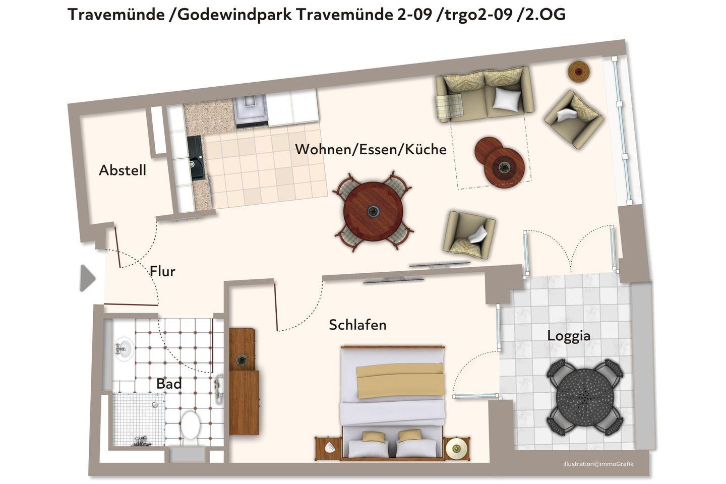 Das 53 m² große 2-Zimmer Apartment ist für bis zu 4 Personen geeignet. Besonders hervorzuheben ist die überdachte Loggia in sonniger West-Lage; hier könnt ihr das wohltuende, maritime Klima der Ostsee und die Sonne bis in den Abend hinein genießen.
