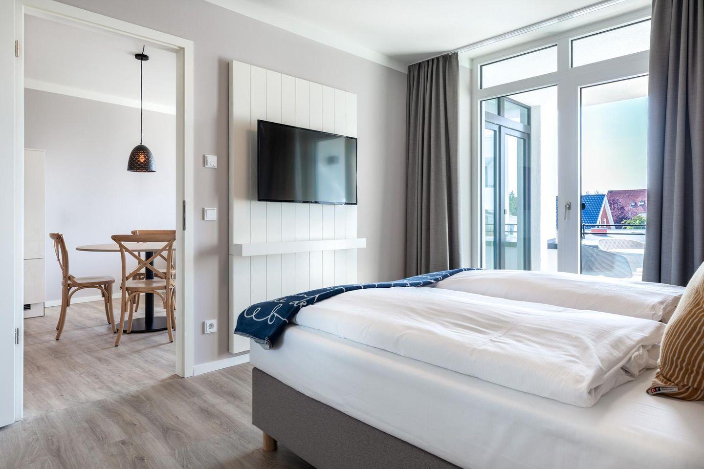 Sonniges Apartment mit Loggia nahe Ostsee, Spa, Dachterrasse und kostenfreiem Tiefgaragenstellplatz.