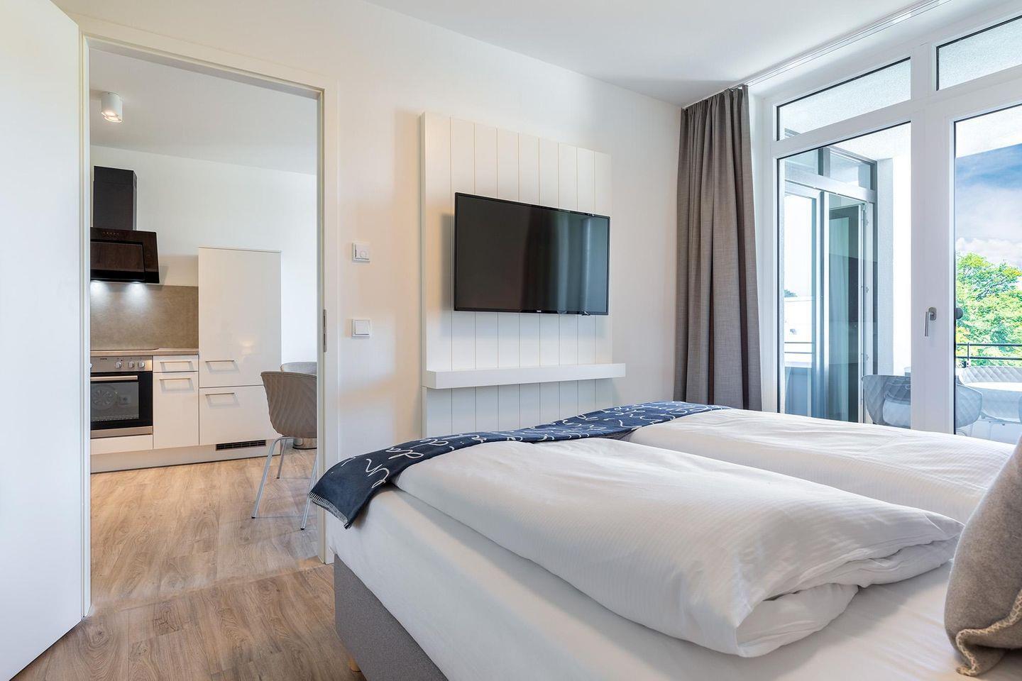 Das helle und moderne Nichtraucher-Apartment verfügt über Fußbodenheizung, sonnenschutzverglaste bodentiefe Fenster, kostenfreies WLAN und eine voll ausgestattete offene Küche mit Geschirrspüler, Gefrier- und Kühlschrankkombination, Eierkocher, Kaffeemaschine, Toaster, Wasserkocher, Mikrowelle, Herd mit Glaskeramikkochfeld und Backofen sowie über einen behaglichen Wohn-Essbereich. Im Wohnbereich befindet sich eine Doppelschlafcouch (1,40 x 2,00 m) und ein SMART-TV (43 Zoll). Im separaten Schlafzimmer genießt ihr hohen Komfort durch ein modernes Boxspringbett (1,80 x 2,00 m) und einen Flatscreen-TV (43 Zoll). Im stilvollen Badezimmer stehen euch eine ebenerdige Dusche, WC, Waschtisch mit Föhn, Handtuchheizkörper und Fußbodenheizung zur Verfügung. Entspannte, sonnige Stunden verbringt ihr auf der überdachten und mit Gartenmöbeln ausgestatteten Loggia. Die Loggia ist sowohl vom Wohnbereich als auch vom Schlafzimmer aus zugänglich.