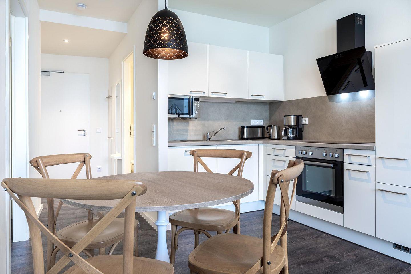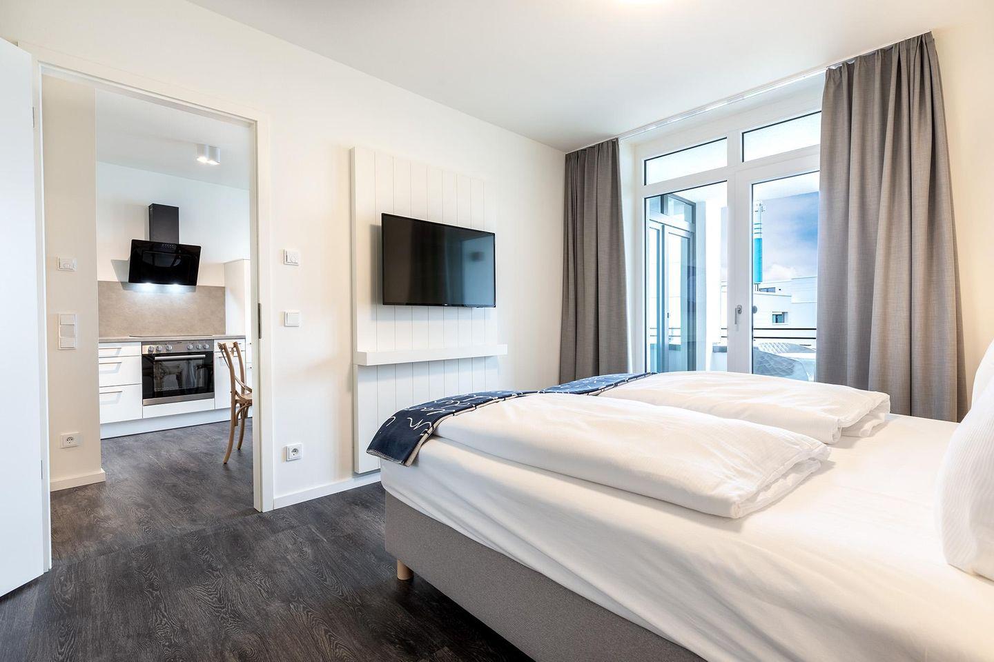Das helle und moderne Nichtraucher-Apartment verfügt über Fußbodenheizung, sonnenschutzverglaste, teilweise bodentiefe Fenster, kostenfreies WLAN und eine voll ausgestattete offene Küche mit Geschirrspüler, Gefrier- und Kühlschrankkombination, Kaffeemaschine, Eierkocher, Toaster, Wasserkocher, Mikrowelle, Herd mit Glaskeramikkochfeld und Backofen sowie über einen behaglichen Wohn-Essbereich. Im Wohnbereich befindet sich eine Doppelschlafcouch (1,40 x 2,00 m) und ein SMART-TV (43 Zoll). Im separaten Schlafzimmer bietet ein modernes Boxspringbett (1,80 x 2,00 m) hohen Schlafkomfort. Auch hier befindet sich ein SMART-TV (43 Zoll). Im stilvollen Badezimmer stehen euch eine ebenerdige Dusche, WC, Waschtisch mit Föhn, Kosmetikspiegel, Handtuchheizkörper und Fußbodenheizung zur Verfügung. Entspannte Stunden verbringt ihr auf der überdachten Loggia, die nach Westen liegt und mit Gartenmöbeln ausgestattet ist. Die Loggia ist sowohl vom Wohnbereich als auch vom Schlafzimmer aus zugänglich.
