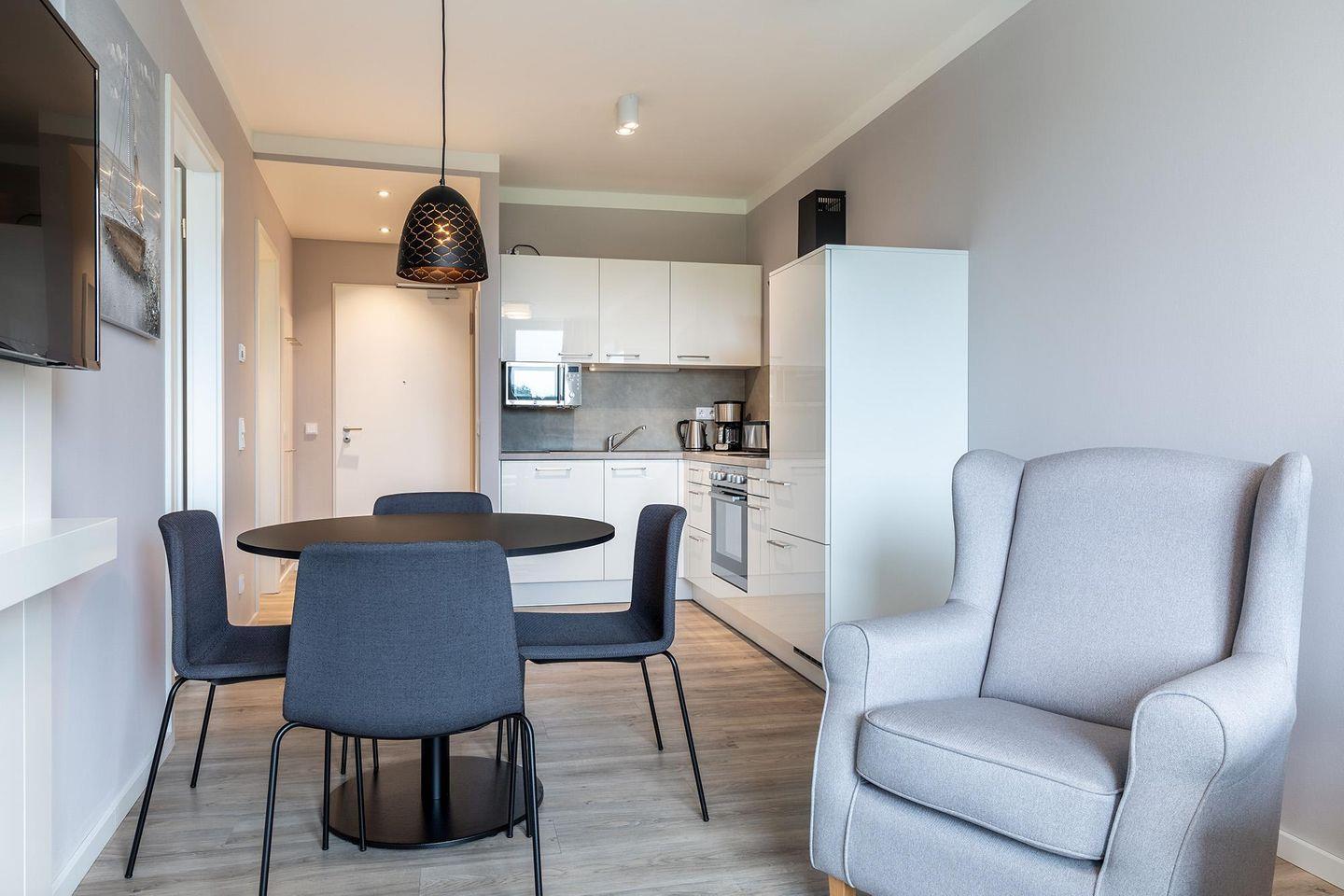 Das helle und moderne Nichtraucher-Apartment verfügt über Fußbodenheizung, sonnenschutzverglaste, teilweise bodentiefe Fenster, kostenfreies WLAN und eine voll ausgestattete offene Küche mit Geschirrspüler, Gefrier- und Kühlschrankkombination, Kaffeemaschine, Eierkocher, Toaster, Wasserkocher, Mikrowelle, Herd mit Glaskeramikkochfeld und Backofen sowie über einen behaglichen Wohn-Essbereich. Im Wohnbereich befindet sich eine Doppelschlafcouch (1,40 x 2,00 m) und ein SMART-TV (43 Zoll). Das separate Schlafzimmer bietet hohen Schlafkomfort durch ein modernes Boxspringbett (1,80 x 2,00 m); auch hier befindet sich ein SMART-TV (43 Zoll). Das stilvolle Badezimmer verfügt über ebenerdige Dusche, WC, Waschtisch mit Föhn, Kosmetikspiegel, Handtuchheizkörper und Fußbodenheizung.