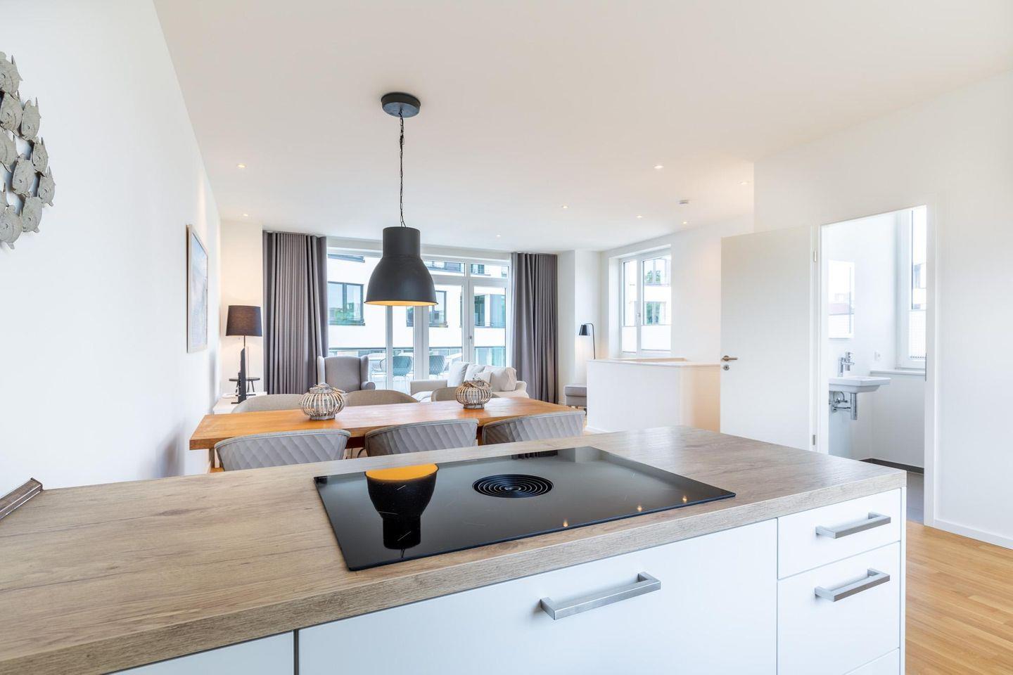 Das helle und moderne Nichtraucher-Apartment verfügt über Echtholzparkett, Fußbodenheizung, sonnenschutzverglaste Fenster und kostenfreies WLAN. Auf der zweiten Wohnebene im zweiten Obergeschoss befindet sich der großzügig konzipierte Wohn-Essbereich und die voll ausgestattete offene Küche mit Geschirrspüler, Gefrier- und Kühlschrankkombination, Kapsel-Kaffeemaschine (Cafissimo), Filter-Kaffeemaschine, Toaster, Wasserkocher, Eierkocher, Mikrowelle, Backofen und Herd mit innovativem BORA Kochfeldabzug sowie ein Bügelbrett und Bügeleisen. Des weiteren verfügt diese Etage über ein separates WC und einen Abstellraum.